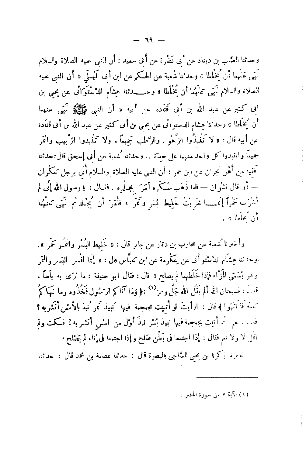 وَحدثنَا الصلب بن ديناد عَنْ أَبِي نَضْرَةَ عَنْ أَبِي 0 سعيد أَن النَّبِي صَلَّى اللَّهُ عَلَيْهِ وَسَلَّمَ نَهَى عَنْهُمَا أَنْ يُخْلَطَا وَحَدَّثَنَا شُعْبَةُ عَنِ الْحَكَمِ عَنِ بن أَبِي لَيْلَى أَنَّ النَّبِيَّ عَلَيْهِ الصَّلَاة والسام نَهَى عَنْهُمَا أَنْ يُخْلَطَا وَحَدَّثَنَا هِشَامٌ الدَّسْتُوَائِيُّ عَنْ يَحْيَى بْنِ أَبِي كَثِيرٍ عَنْ عَبْدِ اللَّهِ بْنِ أَبِي قَتَادَةَ عَنْ أَبِيهِ أَن النَّبِي صَلَّى اللَّهُ عَلَيْهِ وَسَلَّمَ نَهَى عَنْهُمَا أَنْ يُخْلَطَا وَحَدَّثَنَا هِشَامٌ الدَّسْتُوَائِيُّ عَنْ يَحْيَى بْنِ أَبِي كَثِيرٍ عَنْ عَبْدِ اللَّهِ بْنِ أَبِي قَتَادَةَ عَنْ أَبِيهِ قَالَ لَا تَنْبِذُوا الزَّهْوَ وَالرُّطَبَ جَمِيعًا وَلا تَنْبِذُوا الزَّبِيبَ وَالتَّمْرَ جَمِيعًا وَانْتَبِذُوا كُلَّ وَاحِدٍ مِنْهُمَا عَلَى حِدَةٍ وَحَدَّثَنَا شُعْبَةُ عَنْ أَبِي إِسْحَاقَ قَالَ حَدَّثَنَا فَقِيهٌ مِنْ أَهْلِ نَجْرَانَ عَنِ بن عُمَرَ أَنَّ النَّبِيَّ صَلَّى اللَّهُ عَلَيْهِ وَسلم أَتَى بِرَجُلٍ سَكْرَانَ أَوْ قَالَ نَشْوَانَ فَلَمَّا ذَهَبَ سُكْرُهُ أَمَرَ بِجَلْدِهِ فَقَالَ يَا رَسُولَ اللَّهِ إِنِّي لَمْ أَشْرَبْ خَمْرًا إِنَّمَا شَرِبْتُ خَلِيطَ بُسْرٍ وَتَمْرٍ فَأَمَرَ أَن يلجد ثُمَّ نَهَى عَنْهُمَا أَنْ يُخْلَطَا وَأَخْبَرَنَا شُعْبَةُ عَنْ مُحَارِبِ بْنِ دِثَارٍ عَنْ جَابِرٍ قَالَ خَلِيطُ الْبُسْرِ وَالتَّمْرِ خَمْرٌ وَحَدَّثَنَا هِشَامٌ الدستوَائي عَن عِكْرِمَة عَن بن عَبَّاسٍ قَالَ إِنَّمَا أَفْسَرَ الْبُسْرَ وَالتَّمْرَ وَهُوَ يُسَمَّى الْمُزَّاءُ فَإِذَا خَلَطَهُمَا لَمْ يَصْلُحْ قَالَ فَقَالَ أَبُو حَنِيفَةَ مَا أَرَى بِهِ بَأْسًا قُلْتُ فَسُبْحَانَ اللَّهِ أَلَمْ يَقُلِ اللَّهُ جَلَّ وَعَزَّ وَمَا آتَاكُمُ الرَّسُولُ فَخُذُوهُ وَمَا نَهَاكُمْ عَنهُ فَانْتَهوا قَالَ أَرَأَيْتَ لَوْ أُتِيتَ بِجُمْجُمَةٍ فِيهَا نَبِيذُ تَمْرٍ نُبِذَ بِالأَمْسِ أَتَشْرَبُهُ قُلْتُ نَعَمْ ثُمَّ أُتِيتَ بِجُمْجُمَةٍ فِيهَا نَبِيذُ بُسْرٍ نُبِذَ أَوَّلَ مِنْ أَمْسِ أَتَشْرَبُهُ فَسَكَتُّ وَلَمْ أَقُلْ لَا وَلا نَعَمْ فَقَالَ إِذَا اجْتَمَعَا فِي بَطْنِ صلح وَإِذَا اجْتَمَعَا فِي إِنَاءٍ لم يصلح خبرنَا زكري - ابْنُ يَحْيَى السَّاجِيُّ بِالْبَصْرَةِ قَالَ حَدَّثَنَا عِصْمَةُ بْنُ مُحَمَّدٍ قَالَ حَدثنَا