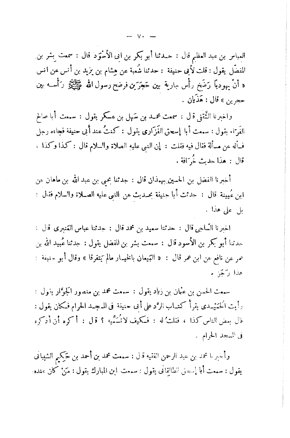 الْعَبَّاسُ بْنُ عَبْدِ الْعَظِيمِ قَالَ حَدَّثَنَا أَبُو بَكْرِ بْنُ أَبِي الأَسْوَدِ قَالَ سَمِعْتُ بِشْرَ بْنَ الْمُفَضَّلِ يَقُولُ قُلْتُ لأَبِي حَنِيفَةَ حَدثنَا شُعْبَة عَن هِشَام عَن يزِيد بْنِ أَنَسٍ عَنْ أَنَسٍ أَنَّ يَهُودِيًّا رَضَخَ رَأْسَ جَارِيَةٍ بَيْنَ حَجَرَيْنِ فَرَضَخَ رَسُولُ اللَّهِ صَلَّى اللَّهُ عَلَيْهِ وَسَلَّمَ رَأْسَهُ بَيْنَ حَجَرَيْنِ قَالَ هَذَيَانٌ وَأَخْبَرَنَا الثَّقَفِيُّ قَالَ سَمِعْتُ مُحَمَّدَ بْنَ سَهْلِ بْنِ عَسْكَرٍ يَقُولُ سَمِعْتُ أَبَا صَالِحٍ الْفَرَّاءَ يَقُولُ سَمِعْتُ أَبَا إِسْحَاقَ الْفَزَارِيَّ يَقُولُ كُنْتُ عِنْدَ أَبِي حَنِيفَةَ فَجَاءَهُ رَجُلٌ فَسَأَلَهُ عَنْ مَسْأَلَةٍ فَقَالَ فِيهِ فَقُلْتُ أَن النَّبِي صَلَّى اللَّهُ عَلَيْهِ وَسلم قَالَ كَذَا وَكَذَا قَالَ هَذَا حَدِيثُ خُرَافَةٍ أَخْبَرَنَا الْفَضْلُ بْنُ الْحُسَيْنِ بِهَمَذَانَ قَالَ حَدَّثَنَا يَحْيَى بْنُ عَبْدِ اللَّهِ بْنِ مَاهَانَ عَن بن عُيَيْنَةَ قَالَ حَدَّثْتُ أَبَا حَنِيفَةَ بِحَدِيث عَن النَّبِي صَلَّى اللَّهُ عَلَيْهِ وَسلم فَقَالَ بَلْ عَلَى هَذَا أَخْبَرَنَا السَّاجِيُّ قَالَ حَدَّثَنَا سَعِيدُ بْنُ مُحَمَّدٍ قَالَ حَدَّثَنَا عَبَّاسٌ الْعَنْبَرِيُّ قَالَ حَدَّثَنَا أَبُو بَكْرِ بْنُ الأَسْوَدِ قَالَ سَمِعْتُ بِشْرَ بْنَ الْمُفَضَّلِ يَقُولُ حَدَّثَنَا عُبَيْدُ اللَّهِ بْنِ عُمَرَ عَنْ نَافِعٍ عَنْ بن عُمَرَ قَالَ الْبَيِّعَانِ بِالْخِيَارِ مَا لَمْ يَتَفَرَّقَا وَقَالَ أَبُو حَنِيفَةَ هَذَا رِجْزٌ سَمِعْتُ الْحَسَنَ بْنَ عُثْمَان بن زِيَاد يَقُول سَمِعت مُحَمَّد بن مَنْصُور الْجوَار يَقُولُ رَأَيْتُ الْحُمَيْدِيَّ يَقْرَأُ كِتَابَ الرَّدِّ عَلَى أَبِي حَنِيفَةَ فِي الْمَسْجِدِ الْحَرَامِ فَكَانَ يَقُولُ قَالَ بَعْضُ النَّاسِ كَذَا فَقُلْتُ لَهُ فيكف لَا تُسَمِّيهِ قَالَ أَكْرَهُ أَنْ أَذْكُرَهُ فِي الْمَسْجِدِ الْحَرَامِ وَأَخْبَرَنَا مُحَمَّد بن عبد الرَّحْمَن الْفَقِيه قَالَ سَمِعْتُ مُحَمَّدَ بْنَ أَحْمَدَ بن حَكِيم الشَّيْبَانِيّ يَقُول سمت أَبَا إِسْحَاق الطَّالقَانِي يَقُول سَمِعت بن الْمُبَارَكِ يَقُولُ مَنْ كَانَ عِنْدَهُ