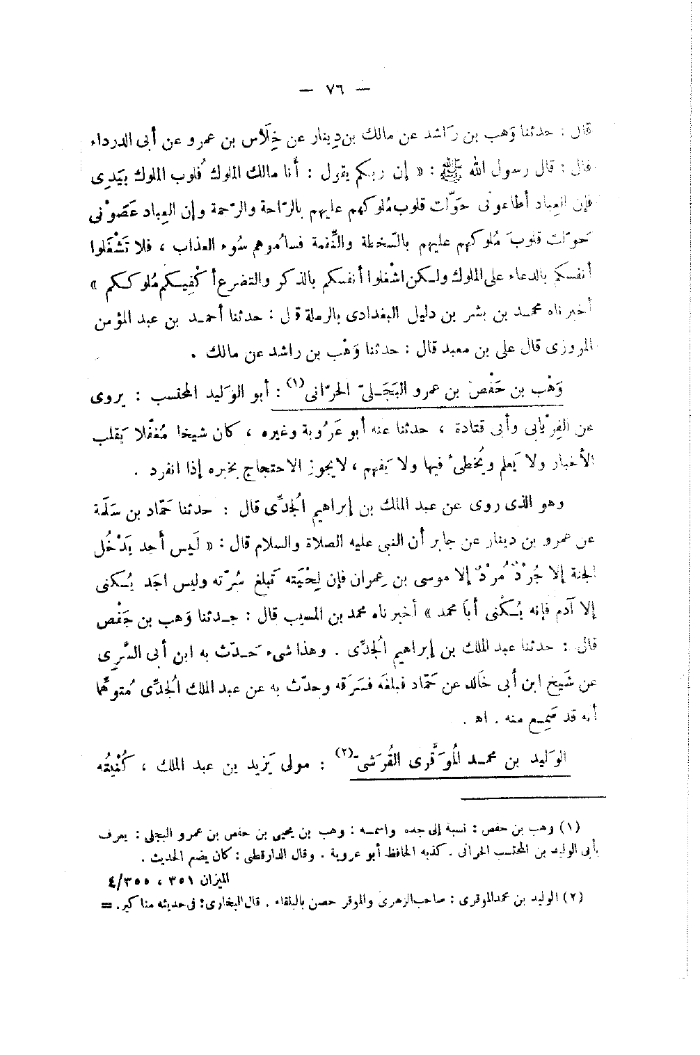 قَالَ حَدَّثَنَا وَهْبُ بْنُ رَاشِدٍ عَنْ مَالِكِ بْنِ دِينَارٍ عَنْ خِلَاسِ بْنِ عَمْرٍو عَنْ أَبِي الدَّرْدَاءِ قَالَ قَالَ رَسُولُ اللَّهِ صَلَّى اللَّهُ عَلَيْهِ وَسَلَّمَ أَن رَبَّكُمْ يَقُولُ أَنَا مَالِكُ الْمُلُوكِ قُلُوبُ الْمُلُوكِ بِيَدِي فَإِنِ الْعِبَادُ أَطَاعُونِي حَوَّلْتُ قُلُوبَ مُلُوكِهِمْ عَلَيْهِمْ بِالرَّاحَةِ وَالرَّحْمَةِ وَإِنِ الْعِبَادُ عَصَوْنِي حَوَّلْتُ قُلُوبَ مُلُوكِهِمْ عَلَيْهِمْ بِالسُّخْطَةِ وَالنِّقْمَةِ فَسَامُوهُمْ سُوءَ الْعَذَابِ فَلا تَشْغَلُوا أَنْفُسَكُمْ بِالدُّعَاءِ عَلَى الْمُلُوكِ وَلَكِنِ اشْغَلُوا أَنْفُسَكُمْ بِالذِّكْرِ وَالتَّضَرُّعِ أَكْفِيكُمْ مُلُوكَكُمْ أَخْبَرَنَاهُ مُحَمَّدُ بْنُ بِشْرِ بْنِ دُلَيْلٍ الْبَغْدَادِيُّ بِالرَّمْلَةِ قَالَ حَدثنَا أَحْمد بن عبد الْمُؤْمِنِ الْمَرْوَزِيُّ قَالَ عَلِيُّ بْنُ مَعْبَدٍ قَالَ حَدَّثَنَا وَهْبُ بْنُ رَاشد عَن مَالك