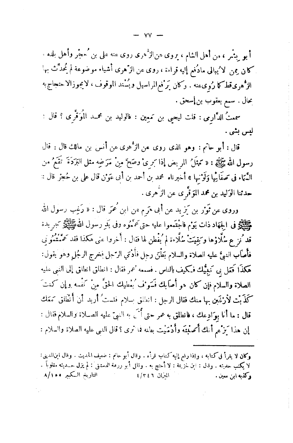 أَبُو بشر من أهل الشَّام يَرْوِي عَن الزُّهْرِيّ روى عَنْهُ عَليّ بن حجر وَأهل بَلَده كَانَ مِمَّن لَا يُبَالِي مَا دفع إِلَيْهِ قِرَاءَة روى عَن الزُّهْرِيّ أَشْيَاء مَوْضُوعَة لم يحدث بهَا الزُّهْرِيّ قطّ كَمَا رُوِيَ عَنهُ وَكَانَ يرفع الْمَرَاسِيل ويسند الْمَوْقُوف لَا يَجُوز الِاحْتِجَاج بِهِ بِحَال سَمِعَ يَعْقُوبَ بْنَ إِسْحَاقَ سَمِعت الدَّارمِيّ قلت ليحيى بن مَعِينٍ فَالْوَلِيدُ بْنُ مُحَمَّدٍ الْمُوَقَّرِيُّ قَالَ لَيْسَ بِشْيَءٍ قَالَ أَبُو حَاتِم وَهُوَ الَّذِي رَوَى عَنْ الزُّهْرِيِّ عَنْ أَنَسِ بْنِ مَالِكٍ قَالَ قَالَ رَسُولُ اللَّهِ صَلَّى اللَّهُ عَلَيْهِ وَسَلَّمَ مَثَلُ الْمَرِيضِ إِذَا بَرِئَ وَصَحَّ مِنْ مَرَضِهِ مَثَلُ الْبُرْدَةِ تَقَعُ مِنَ السَّمَاءِ فِي صَفَائِهَا وَلَوْنِهَا أَخْبَرَنَاهُ مُحَمَّدُ بن أَحْمد بن أبي عون قَالَ عَلِيُّ بْنُ حُجْرٍ قَالَ حَدَّثَنَا الْوَلِيدُ بْنُ مُحَمَّدٍ الْمُوَقَّرِيُّ عَنِ الزُّهْرِيِّ وَرَوَى عَنْ ثَوْرِ بْنِ يَزِيدَ عَنْ أَبِي هَرِمٍ عَن بن عُمَرَ قَالَ رَغِبَ رَسُولُ اللَّهِ صَلَّى اللَّهُ عَلَيْهِ وَسَلَّمَ فِي الْجِهَادِ ذَاتَ يَوْمٍ فَاجْتَمَعُوا عَلَيْهِ حَتَّى عَمَّمُوهُ وَفِي يَدِ رَسُولِ اللَّهِ صَلَّى اللَّهُ عَلَيْهِ وَسَلَّمَ جَرِيدَةٌ قَدْ نُزِعَ سُلاؤُهَا وَبَقِيَتْ سُلاءَةٌ لَمْ يَفْطُنْ لَهَا فَقَالَ أَخِّرُوا عَنِّي هَكَذَا فَقَدْ عَمَّمْتُمُونِي فَأصَاب النَّبِي صَلَّى اللَّهُ عَلَيْهِ وَسَلَّمَ بَطْنَ رَجُلٍ فَأَدْمَى الرَّجُلُ فَخَرَجَ الرَّجُلُ وَهُوَ يَقُولُ هَكَذَا فَعَلَ بِي نَبِيُّكُمْ فَكَيْفَ بِالنَّاسِ فَسَمِعَهُ عمر فَقَالَ انْطلق انْطلق إِلَى النَّبِي صَلَّى اللَّهُ عَلَيْهِ وَسلم فَإِنْ كَانَ هُوَ أَصَابَكَ فَسَوْفَ يُعْطِيكَ الْحَقَّ مِنْ نَفْسِهِ وَإِنْ كُنْتَ كَذَبْتَ لأَرْغَبَنَّ بِهَا مِنْكَ فَقَالَ الرَّجُلُ انْطَلِقْ بِسَلامٍ فَلَسْتُ أُرِيدُ أَنْ أَنْطَلِقَ مَعَكَ قَالَ مَا أَنا بواعدك فَانْطَلَقَ بِهِ عُمَرُ حَتَّى أَتَى بِهِ النَّبِي صَلَّى اللَّهُ عَلَيْهِ وَسَلَّمَ فَقَالَ إِنَّ هَذَا يَزْعُمُ أَنَّكَ أَصَبْتَهُ وَأَدْمَيْتَ بَطْنَهُ فَمَا تَرَى قَالَ النَّبِي