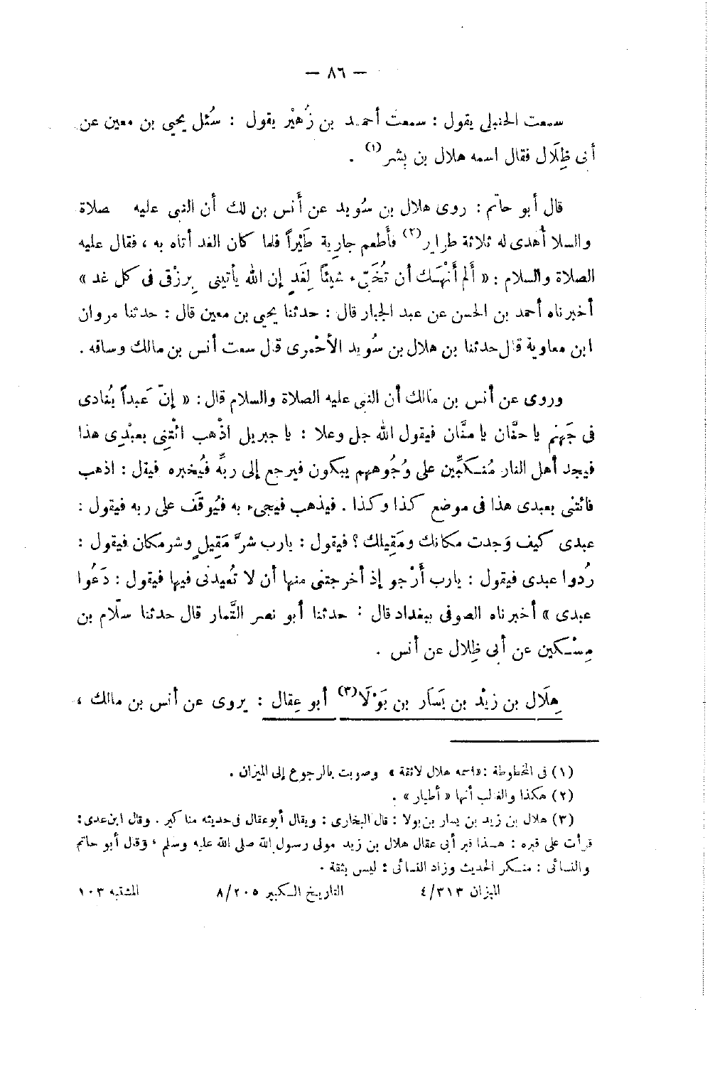 سَمِعْتُ الْحَنْبَلِيَّ يَقُولُ سَمِعْتُ أَحْمَدَ بْن زُهَيْر يَقُول سُئِلَ يَحْيَى بْنَ مَعِينٍ عَنْ أَبِي ظِلالٍ فَقَالَ اسْمُهُ هِلالُ بْنُ بِشْرٍ قَالَ أَبُو حَاتِمٍ رَوَى هِلالُ بْنُ سُوَيْدٍ عَنْ أَنَسِ بْنِ مَالِكٍ أَنَّ النَّبِيَّ صَلَّى اللَّهُ عَلَيْهِ وَسلم أُهْدِيَ لَهُ ثَلاثَةُ طراير فَأَطْعَمَ جَارِيَةً طَيْرًا فَلَمَّا كَانَ الْغَدُ أَتَاهُ بِهِ فَقَالَ صَلَّى اللَّهُ عَلَيْهِ وَسَلَّمَ ألم أَنْهَك أَن تخبىء شَيْئًا لِغَدٍ إِنَّ اللَّهَ يَأْتِينِي بِرِزْقِي فِي كُلِّ غَدٍ أَخْبَرَنَاهُ أَحْمد بن الْحسن عَن عَبْدِ الْجَبَّارِ قَالَ حَدَّثَنَا يَحْيَى بْنُ مَعِينٍ قَالَ حَدَّثَنَا مَرْوَانُ بن مُعَاوِيَة قَالَ حَدثنَا بن هِلالُ بْنُ سُوَيْدٍ الأَحْمَرِيُّ قَالَ سَمِعْتُ أَنَسَ بْنَ مَالِكٍ وَسَاقَهُ وَروى عَن أَنَس بْن مَالِك أَن النَّبِي صَلَّى اللَّهُ عَلَيْهِ وَسلم قَالَ إِنَّ عَبْدًا يُنَادِي فِي جَهَنَّمَ يَا حَنَّانُ يَا مَنَّانُ فَيَقُولُ اللَّهُ جَلَّ وَعَلا يَا جِبْرِيلُ اذْهَبِ ائْتِنِي بِعَبْدِي هَذَا فَيَجِدُ أَهْلَ النَّارِ مُنْكَبِّينَ عَلَى وُجُوهِهِمْ يَبْكُونَ فَيَرْجِعُ إِلَى رَبِّهِ فيخبره فيقل اذْهَبْ فَائْتِنِي بِعَبْدِي هَذَا فِي مَوْضِعِ كَذَا وَكَذَا فَيَذْهَبُ فَيَجِيءُ بِهِ فَيُوقَفُ عَلَى رَبِّهِ فَيَقُولُ عَبْدِي كَيْفَ وَجَدْتَ مَكَانَكَ وَمَقِيلَكَ فَيَقُولُ يَا رَبِّ شَرُّ مَقِيلٍ وَشَرُّ مَكَانٍ فَيَقُولُ رُدُّوا عَبْدِي فَيَقُولُ يَا رَبِّ أَرْجُو إِذَا أَخْرَجْتَنِي مِنْهَا أَنْ لَا تُعِيدَنِي فِيهَا فَيَقُولُ دَعَوْا عَبْدِي أَخْبَرَنَاهُ الصُّوفِيُّ بِبَغْدَادَ قَالَ حَدَّثَنَا أَبُو نَصْرٍ التَّمَّارُ قَالَ حَدَّثَنَا سَلامُ بْنُ مِسْكِينٍ عَنْ أَبِي ظِلالٍ عَن أنس