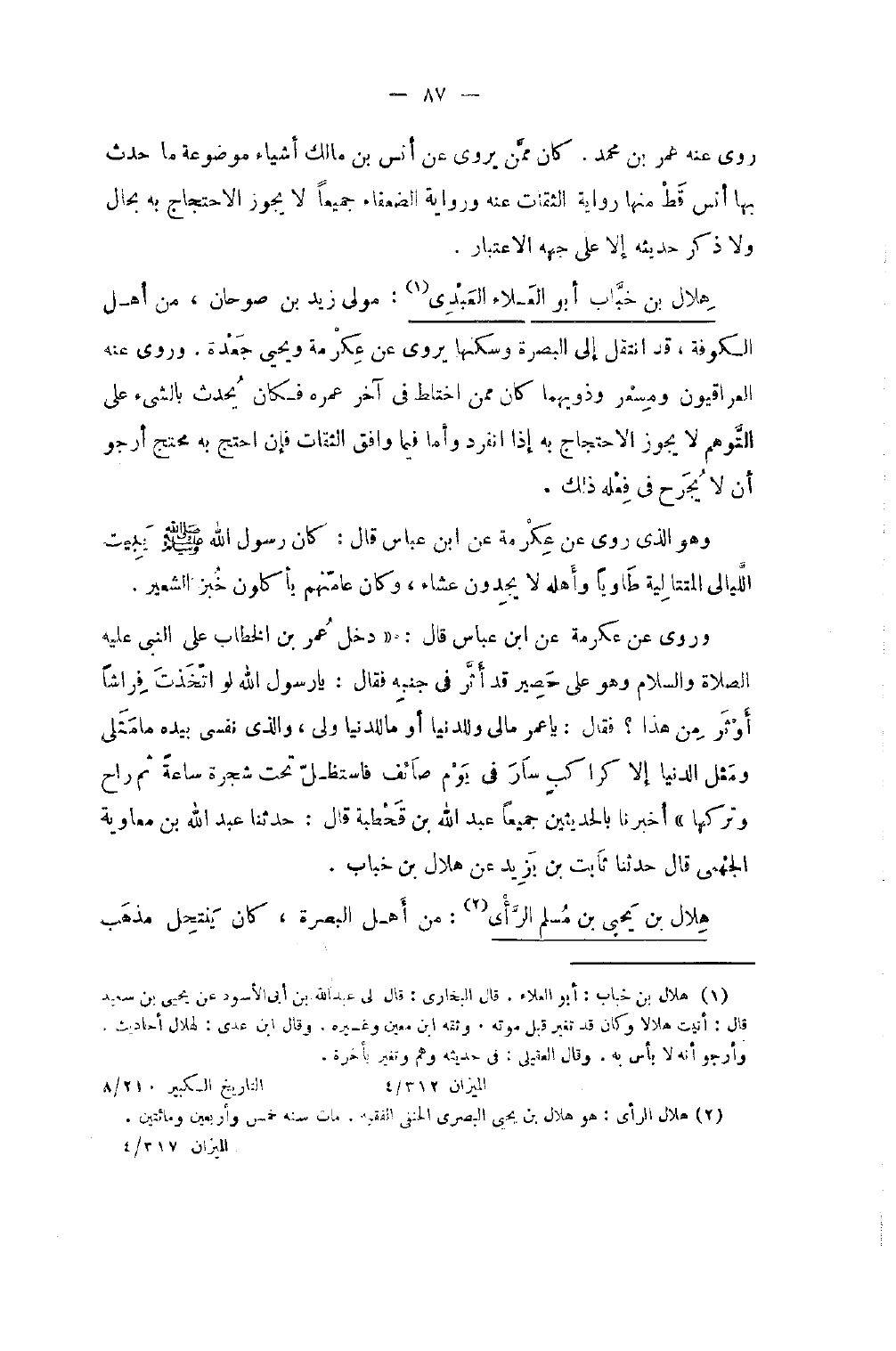 1150 - هِلَال بن خباب أَبُو الْعَلَاء الْعَبْدي مولى زيد بن صوحان من أهل الْكُوفَة قد انْتقل إِلَى الْبَصْرَة وسكنها يروي عَن عِكْرِمَة وَيحيى جعدة وروى عَنهُ الْعِرَاقِيُّونَ ومسعر وذويهما كَانَ مِمَّن اخْتَلَط فِي آخر عمره فَكَانَ يحدث بالشَّيْء على التَّوَهُّم لَا يجوز الِاحْتِجَاج بِهِ إِذا انْفَرد وَأما فِيمَا وَافق الثِّقَات فَإِن احْتج بِهِ مُحْتَج أَرْجُو أَن لَا يجرح فِي فعله ذَلِك وَهُوَ الَّذِي روى عَن عِكْرِمَة عَن بن عَبَّاسٍ قَالَ كَانَ رَسُولُ اللَّهِ صَلَّى اللَّهُ عَلَيْهِ وَسَلَّمَ يَبِيتُ اللَّيَالِيَ الْمُتَتَالِيةِ طَاوِيًا وَأَهْلُهُ لَا يَجِدُونَ عَشَاءً وَكَانَ عَامَّتُهُمْ يَأْكُلُونَ خُبْزَ الشَّعِيرِ وَرَوَى عَنْ عِكْرِمَةَ عَن بن عَبَّاسٍ قَالَ دَخَلَ عُمَرُ بْنُ الْخطاب على النَّبِي صَلَّى اللَّهُ عَلَيْهِ وَسلم وَهُوَ عَلَى حَصِيرٍ قَدْ أَثَّرَ فِي جَنْبِهِ فَقَالَ يَا رَسُولَ اللَّهِ لَوِ اتَّخَذْتَ فِرَاشًا أَوْثَرَ مِنْ هَذَا فَقَالَ يَا عُمَرُ مَالِي وللدنيا أَو مَا للدنا وَلِي وَالَّذِي نَفْسِي بِيَدِهِ مَا مثلي وَمثل الدُّنْيَا لَا كَرَاكِبٍ سَارَ فِي يَوْمٍ صَائِفٍ فَاسْتَظَلَّ تَحْتَ شَجَرَةٍ سَاعَةً ثُمَّ رَاحَ وَتَرَكَهَا أَخْبَرَنَا بِالْحَدِيثَيْنِ جَمِيعًا عبد الله بن قَحْطَبَةَ قَالَ حَدَّثَنَا عَبْدُ اللَّهِ بْنُ مُعَاوِيَةَ الْجَهْمِيُّ قَالَ حَدَّثَنَا ثَابِتُ بْنُ يزِيد عَن هِلَال بن خباب