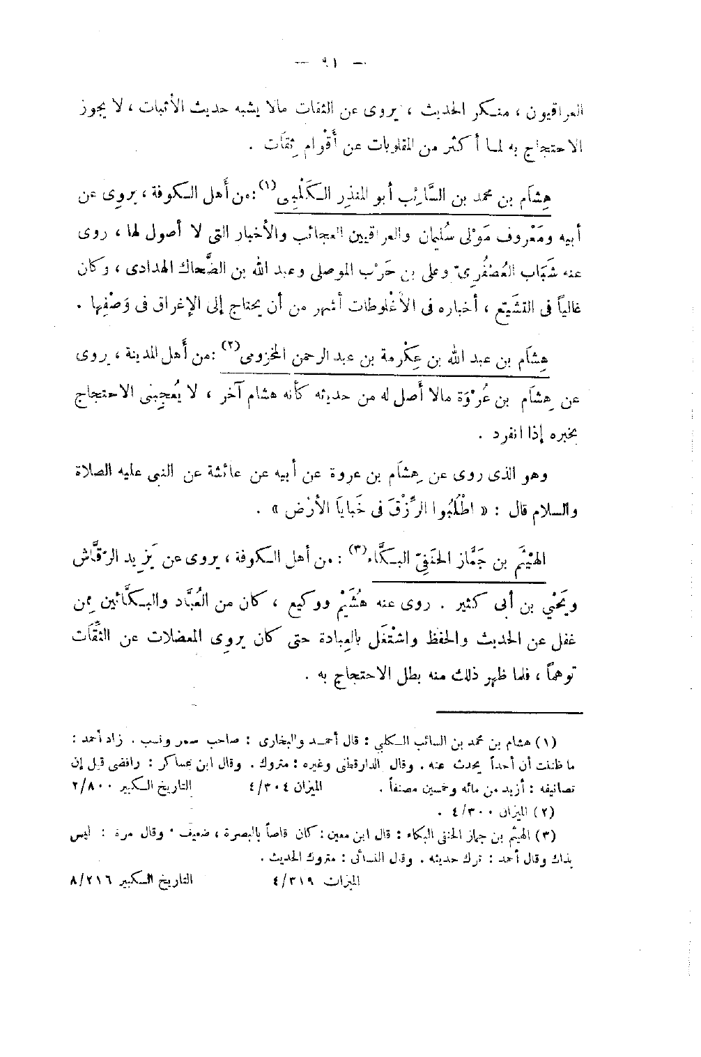 1157 - هِشَام بن مُحَمَّد بن السَّائِب أَبُو الْمُنْذر الْكَلْبِيّ من أهل الْكُوفَة يروي عَن أَبِيه ومعروف مولى سُلَيْمَان والعراقيين الْعَجَائِب وَالْأَخْبَار الَّتِي لَا أصُول لَهَا روى عَنهُ شباب الْعُصْفُرِي وَعلي بن حَرْب الْموصِلِي وَعبد الله بن الضَّحَّاك الهدادي وَكَانَ غاليا فِي التَّشَيُّع أخباره فِي الأغلوطات أشهر من أَن يحْتَاج إِلَى الإغراق فِي وصفهَا