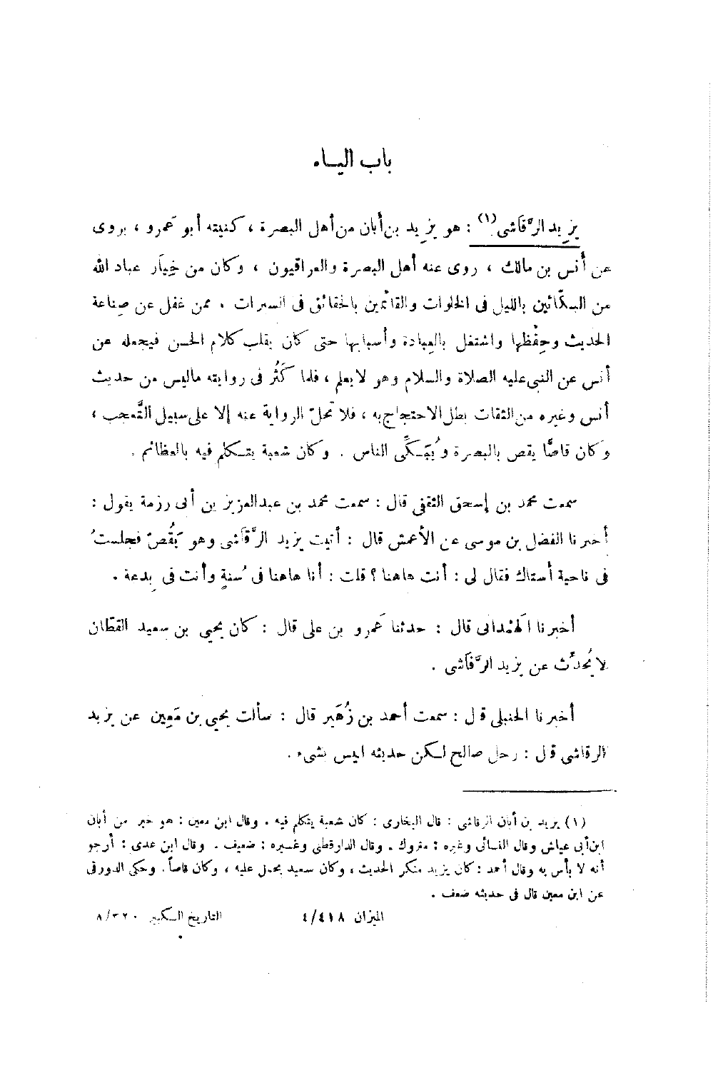 1175 - يزِيد الرقاشِي هُوَ يزِيد بن أبان من أهل الْبَصْرَة كنيته أَبُو عَمْرو يروي عَن أنس بن مَالِك روى عَنْهُ أهل الْبَصْرَة والعراقيون وَكَانَ من خِيَار عباد الله من البكائين بِاللَّيْلِ فِي الخلوات والقائمين بالحقائق فِي السبرات مِمَّن غفل عَن صناعَة الْحَدِيث وحفظها واشتغل بِالْعبَادَة وأسبابها حَتَّى كَانَ يقلب كَلَام الْحسن فَيَجْعَلهُ عَن أنس عَن النَّبِي صَلَّى اللَّهُ عَلَيْهِ وَسَلَّمَ وَهُوَ لَا يعلم فَلَمَّا كثر فِي رِوَايَته مَا لَيْسَ من حَدِيث أنس وَغَيره من الثِّقَات بَطل الِاحْتِجَاج بِهِ فَلَا تحل الرِّوَايَة عَنهُ إِلَّا على سَبِيل التَّعَجُّب وَكَانَ قَاصا يقص بِالْبَصْرَةِ ويبكي النَّاس وَكَانَ شُعْبَة يتَكَلَّم فِيهِ بالعظائم سَمِعت مُحَمَّد بن إِسْحَاق الثَّقَفِيّ قَالَ سَمِعْتُ مُحَمَّدَ بْنَ عَبْدِ الْعَزِيزِ بْنِ أَبِي رِزْمَةَ يَقُولُ أَخْبَرَنَا الْفَضْلُ بْنُ مُوسَى عَنِ الأَعْمَشِ قَالَ أَتَيْتُ يَزِيدَ الرَّقَاشِيَّ وَهُوَ يَقُصُّ فَجَلَسْتُ فِي نَاحِيَةٍ أَسْتَاكُ فَقَالَ لِي أَنْتَ هَاهُنَا قُلْتُ أَنَا هَاهُنَا فِي سُنَّةٍ وَأَنْتَ فِي بِدْعَةٍ أَخْبَرَنَا الْهَمْدَانِيُّ قَالَ حَدثنَا عَمْرو بن عَليّ قَالَ كَانَ يَحْيَى بْنُ سَعِيدٍ الْقَطَّانُ لَا يُحَدِّثُ عَنْ يَزِيدَ الرَّقَاشِيِّ أَخْبَرَنَا الْحَنْبَلِيُّ قَالَ سَمِعْتُ أَحْمَدَ بْنَ زُهَيْرٍ قَالَ سَأَلْتُ يَحْيَى بْنَ مَعِينٍ عَنْ يَزِيدَ الرَّقَاشِيِّ قَالَ رَجُلٌ صَالِحٌ لَكِنَّ حَدِيثه لَيْسَ بِشَيْء
