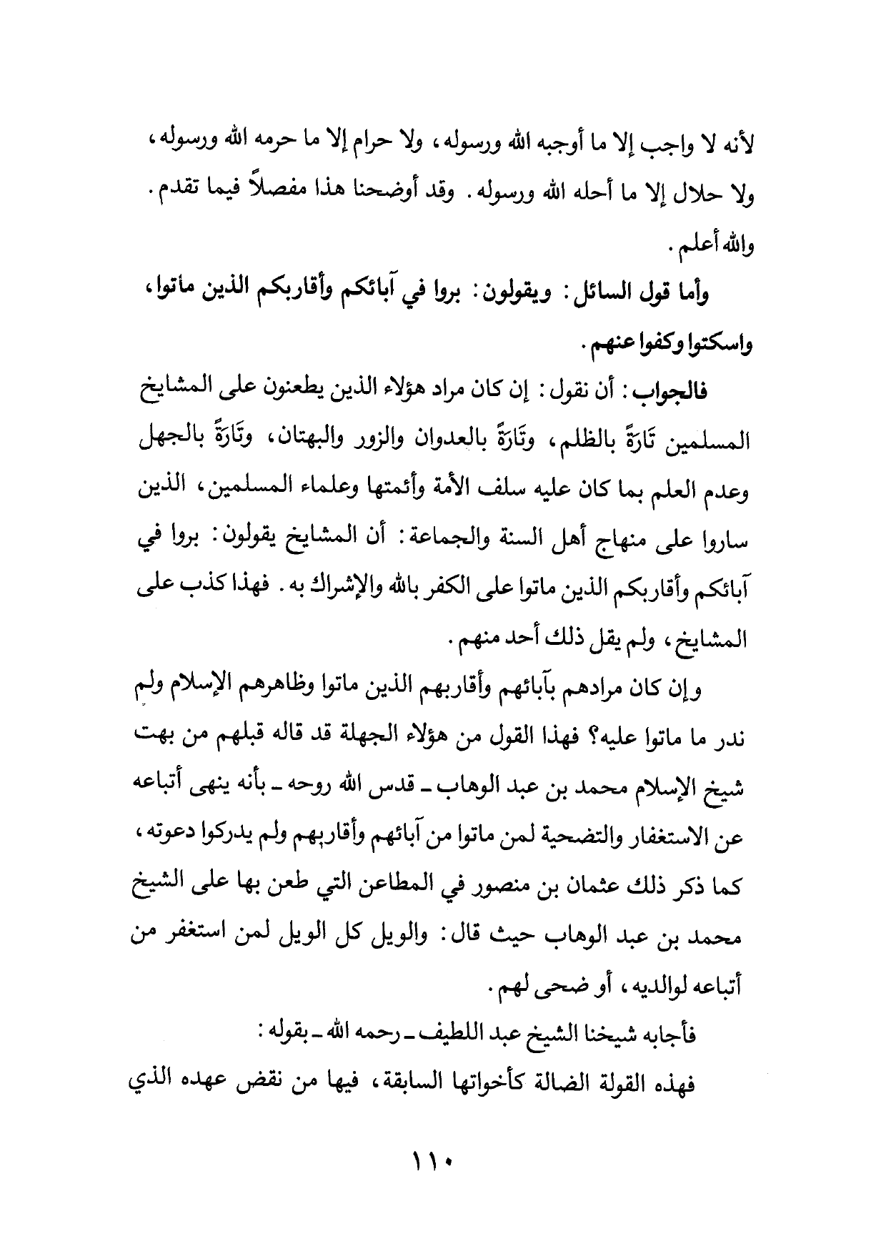 فالجواب: أن نقول: إن كان مراد هؤلاء الذين يطعنون على المشايخ المسلمين تارة بالظّلم, وتارة بالعدوان والزور والبهتان, وتارة بالجهل وعدم العلم بما كان عليه سلف الأمة وأئمتها وعلماء المسلمين, الذين ساروا على منهاج أهل السنة والجماعة: أن المشايخ يقولون: بروا في آبائكم وأقاربكم الذين ماتوا على الكفر بالله والإشراك به. فهذا كذب على المشايخ, ولم يقل ذلك أحد منهم.