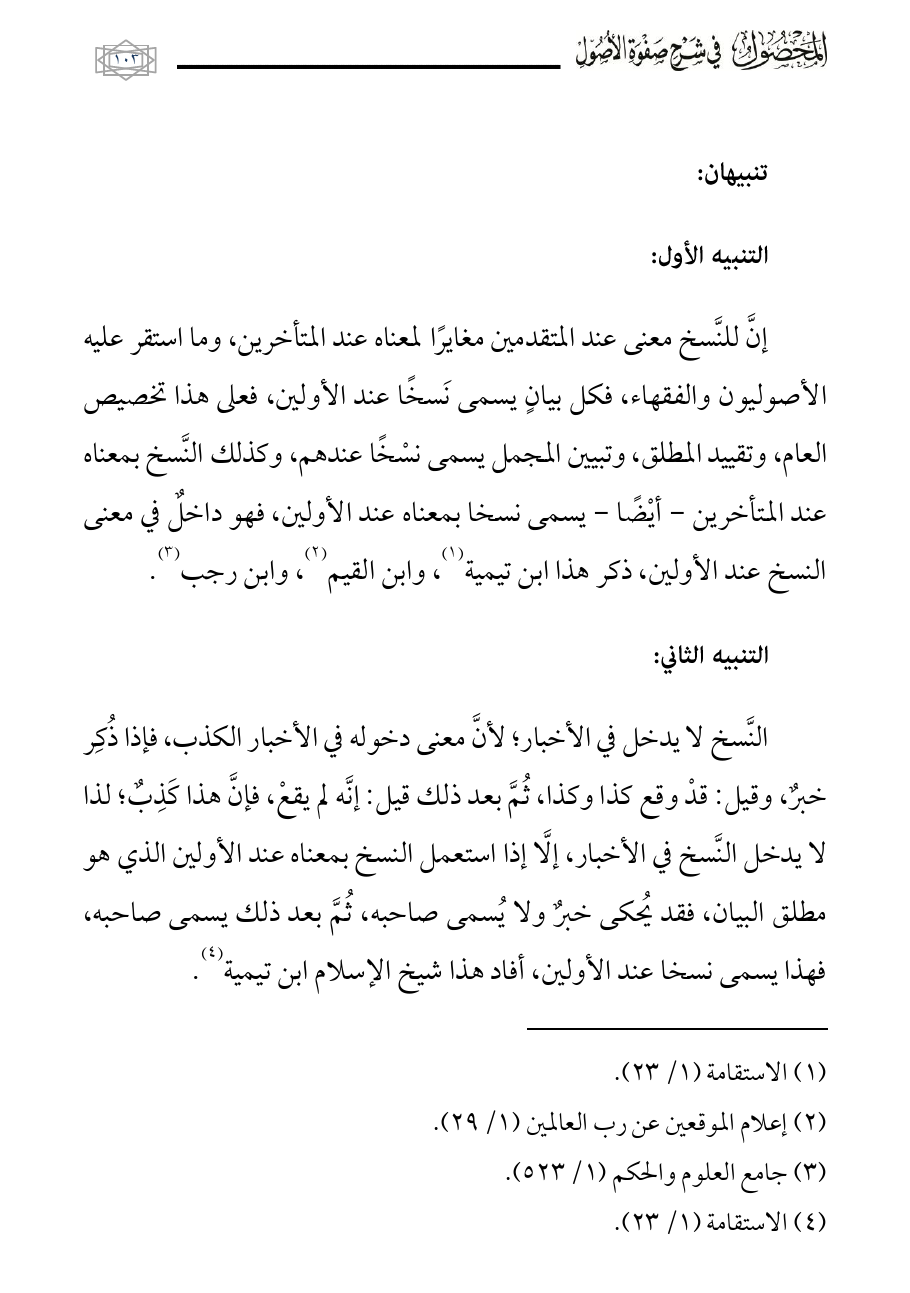 إنَّ للنَّسخ معنى عند المتقدمين مغايرًا لمعناه عند المتأخرين، وما استقر عليه الأصوليون والفقهاء، فكل بيانٍ يسمى نَسخًا عند الأولين، فعلى هذا تخصيص العام، وتقييد المطلق، وتبيين المجمل يسمى نسْخًا عندهم، وكذلك النَّسخ بمعناه عند المتأخرين - أيْضًا - يسمى نسخا بمعناه عند الأولين، فهو داخلٌ في معنى النسخ عند الأولين، ذكر هذا ابن تيمية (¬١)، وابن القيم (¬٢) , وابن رجب (¬٣).
