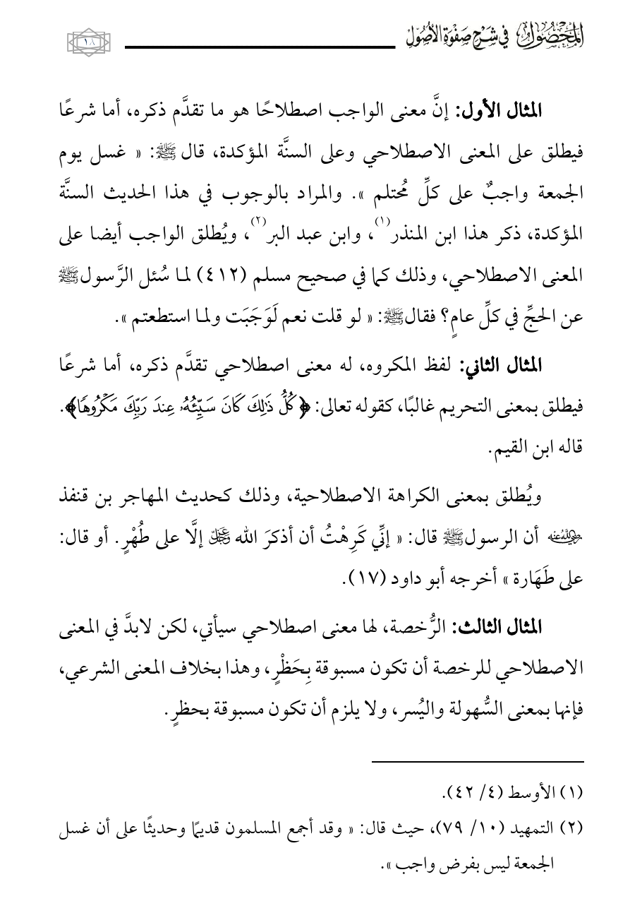 المثال الأول: إنَّ معنى الواجب اصطلاحًا هو ما تقدَّم ذكره، أما شرعًا فيطلق على المعنى الاصطلاحي وعلى السنَّة المؤكدة، قال - صلى الله عليه وسلم -: «غسل يوم الجمعة واجبٌ على كلِّ مُحتلم». والمراد بالوجوب في هذا الحديث السنَّة المؤكدة، ذكر هذا ابن المنذر (¬١)، وابن عبد البر (¬٢)، ويُطلق الواجب أيضا على المعنى الاصطلاحي، وذلك كما في صحيح مسلم (٤١٢) لما سُئل الرَّسول - صلى الله عليه وسلم - عن الحجِّ في كلِّ عامٍ؟ فقال - صلى الله عليه وسلم -: «لو قلت نعم لَوَجَبَت ولما استطعتم».