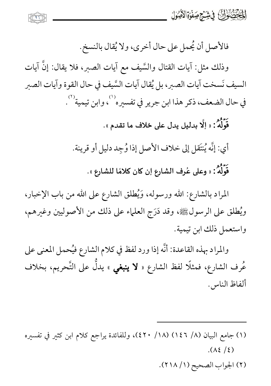 والمراد بهذه القاعدة: أنَّه إذا ورد لفظ في كلام الشارع فيُحمل المعنى على عُرف الشارع، فمثلًا لفظ الشارع «لا ينبغي» يدلُّ على التَّحريم، بخلاف ألفاظ الناس.
