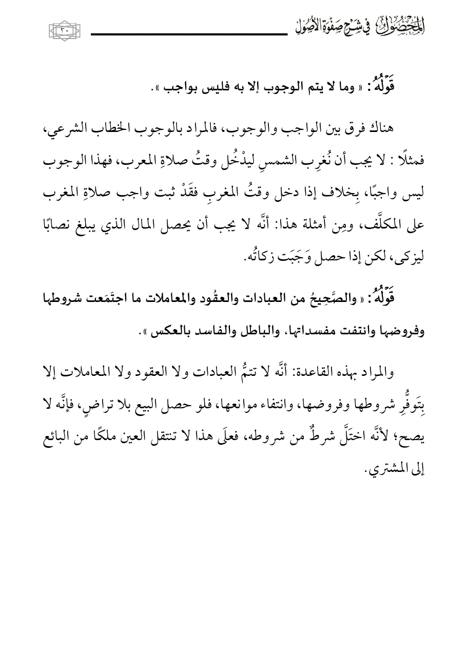 والمراد بهذه القاعدة: أنَّه لا تتمُّ العبادات ولا العقود ولا المعاملات إلا بِتَوفُّرِ شروطها وفروضها، وانتفاء موانعها، فلو حصل البيع بلا تراضٍ، فإنَّه لا يصح؛ لأنَّه اختَلَّ شرطٌ من شروطه، فعلَى هذا لا تنتقل العين ملكًا من البائع إلى المشتري.