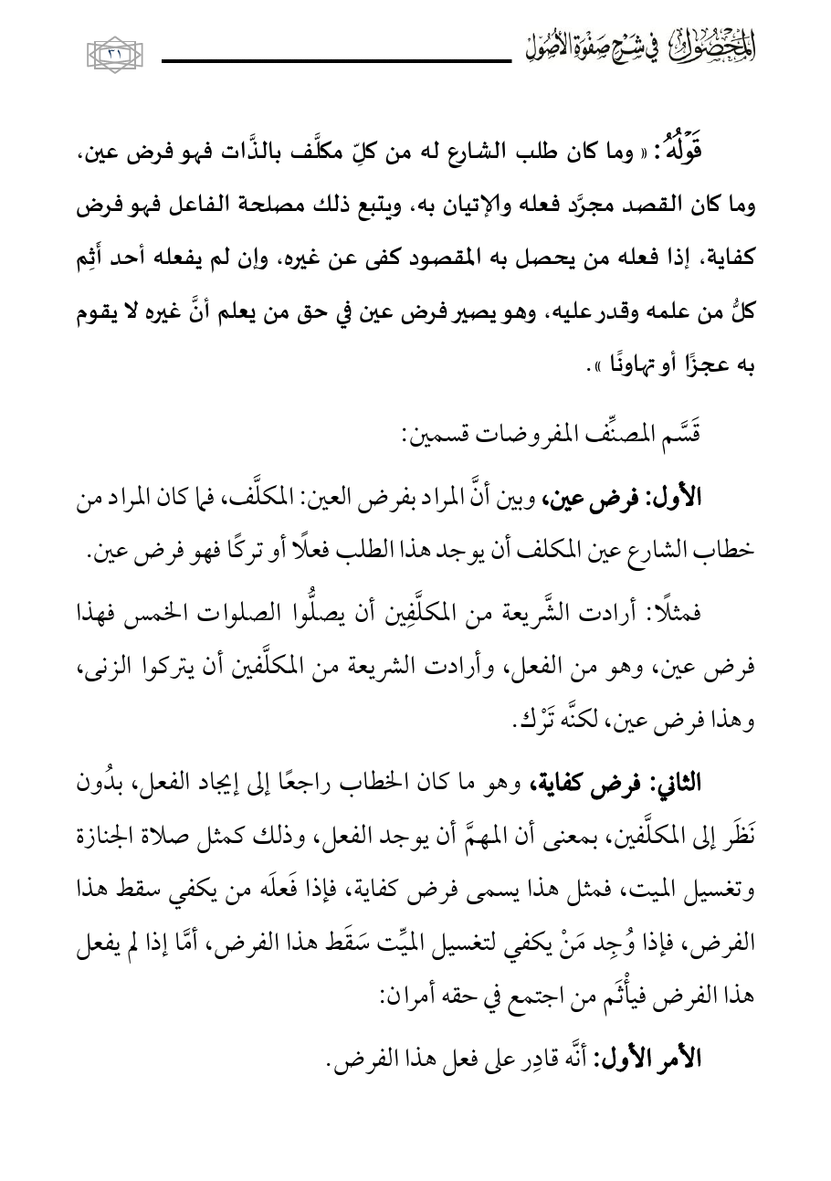 قَوْلُهُ: «وما كان طلب الشارع له من كلِّ مكلَّف بالذَّات فهو فرض عين، وما كان القصد مجرَّد فعله والإتيان به، ويتبع ذلك مصلحة الفاعل فهو فرض كفاية، إذا فعله من يحصل به المقصود كفى عن غيره، وإن لم يفعله أحد أَثِم كلُّ من علمه وقدر عليه، وهو يصير فرض عين في حق من يعلم أنَّ غيره لا يقوم به عجزًا أو تهاونًا».