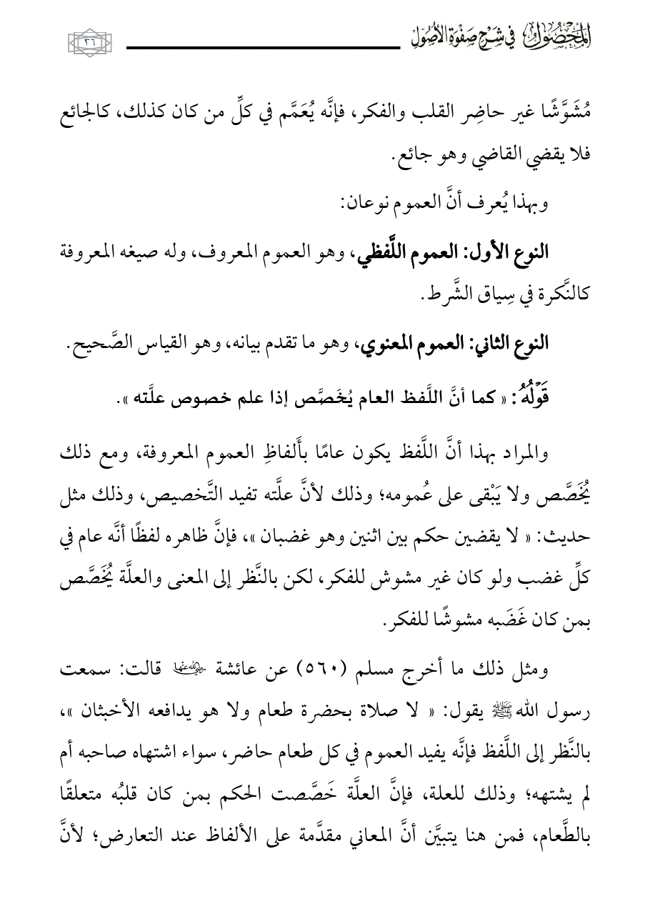 ومثل ذلك ما أخرج مسلم (٥٦٠) عن عائشة - رضي الله عنها - قالت: سمعت رسول الله - صلى الله عليه وسلم - يقول: «لا صلاة بحضرة طعام ولا هو يدافعه الأخبثان»، بالنَّظر إلى اللَّفظ فإنَّه يفيد العموم في كل طعام حاضر، سواء اشتهاه صاحبه أم لم يشتهه؛ وذلك للعلة، فإنَّ العلَّة خَصَّصت الحكم بمن كان قلبُه متعلقًا بالطَّعام، فمن هنا يتبيَّن أنَّ المعاني مقدَّمة على الألفاظ عند التعارض؛ لأنَّ