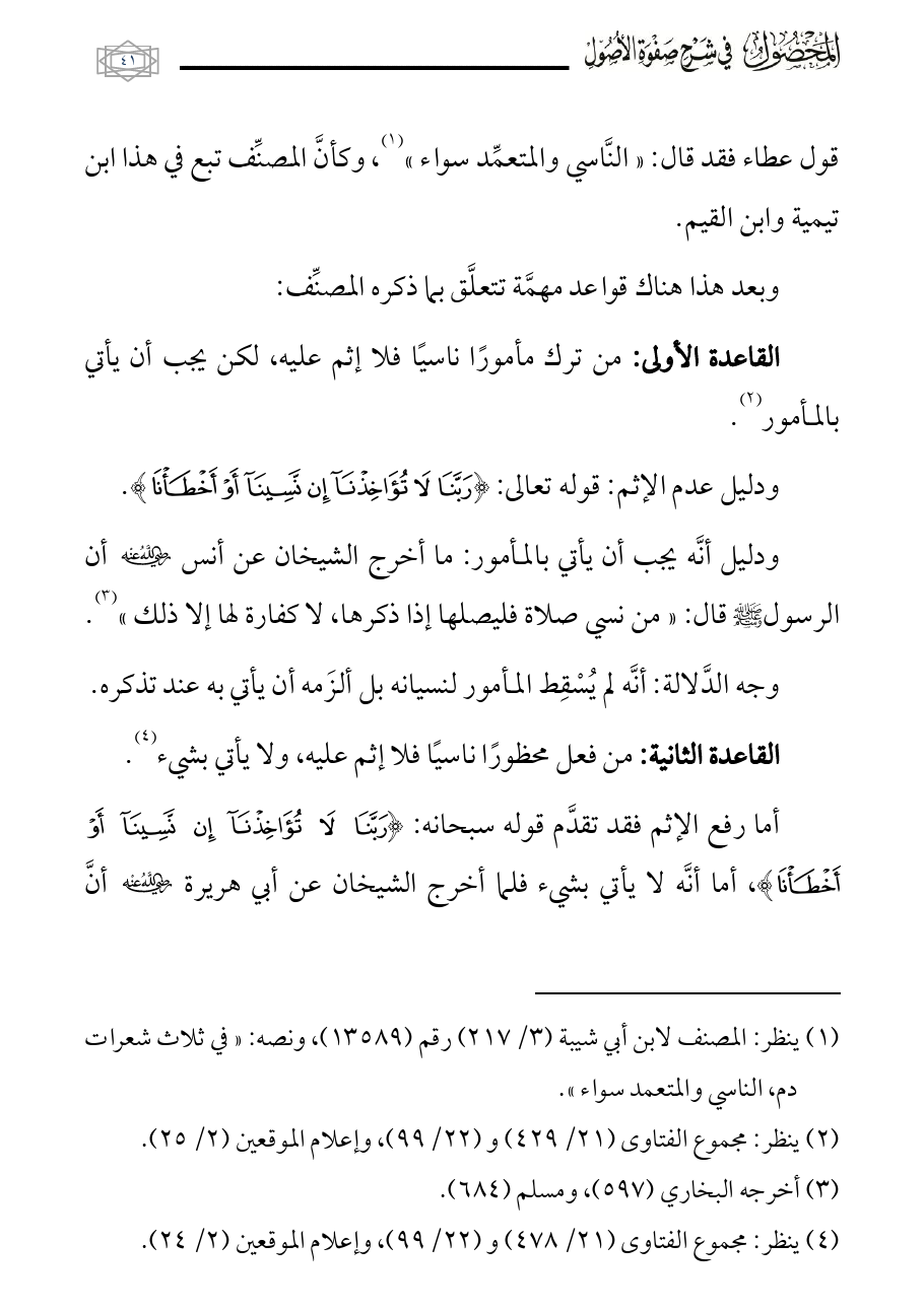 القاعدة الأولى: من ترك مأمورًا ناسيًا فلا إثم عليه، لكن يجب أن يأتي بالمأمور (¬٢).
