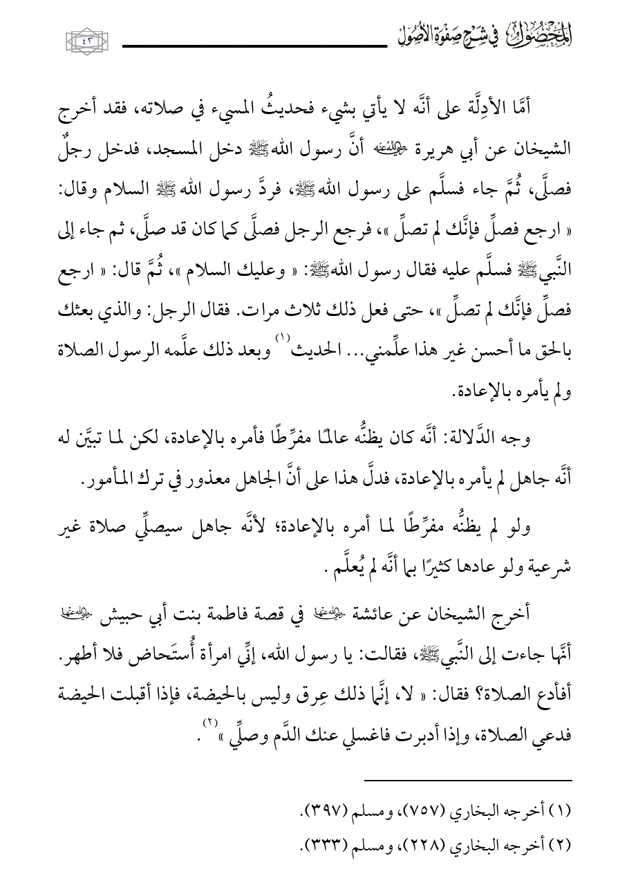 وجه الدَّلالة: أنَّه كان يظنُّه عالمًا مفرِّطًا فأمره بالإعادة، لكن لما تبيَّن له أنَّه جاهل لم يأمره بالإعادة، فدلَّ هذا على أنَّ الجاهل معذور في ترك المأمور.