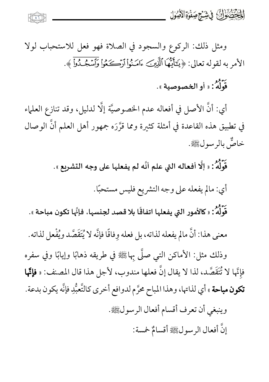 أي: أنَّ الأصل في أفعاله عدم الخصوصيَّة إلَّا لدليل، وقد تنازع العلماء في تطبيق هذه القاعدة في أمثلة كثيرة ومما قرَّرَه جمهور أهل العلم أنَّ الوصال خاصٌّ بالرسول - صلى الله عليه وسلم -.