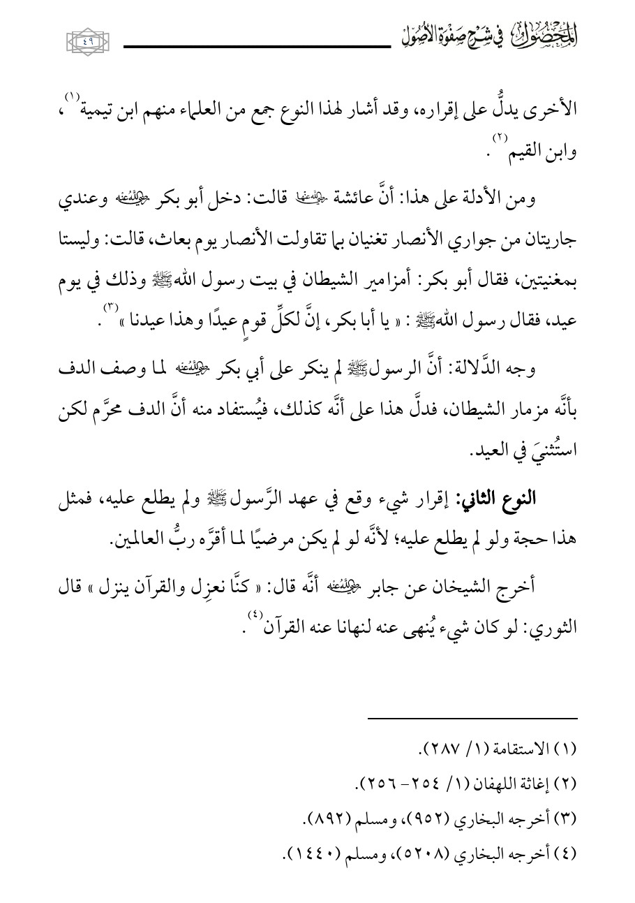الأخرى يدلُّ على إقراره، وقد أشار لهذا النوع جمع من العلماء منهم ابن تيمية (¬١)، وابن القيم (¬٢).