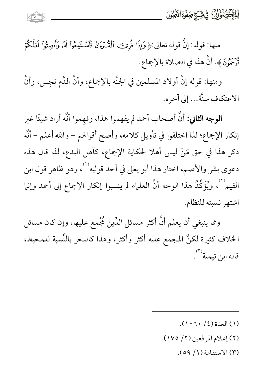 الوجه الثاني: أنَّ أصحاب أحمد لم يفهموا هذا، وفهِموا أنَّه أراد شيئًا غير إنكار الإجماع؛ لذا اختلفوا في تأويل كلامه، وأصح أقوالهم - والله أعلم - أنَّه ذكر هذا في حق مَنْ ليس أهلا لحكاية الإجماع، كأهل البدع، لذا قال هذه دعوى بشر والأصم، اختار هذا أبو يعلى في أحد قوليه (¬١)، وهو ظاهر قول ابن القيم (¬٢)، ويُؤَكِّدُ هذا الوجه أنَّ العلماء لم ينسبوا إنكار الإجماع إلى أحمد وإنما اشتهر نسبته للنظام.