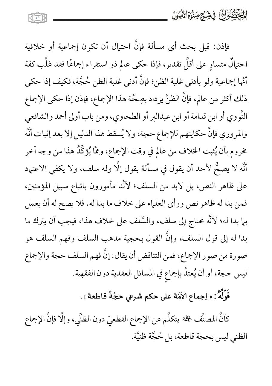 فإذن: قبل بحث أي مسألة فإنَّ احتمال أن تكون إجماعية أو خلافية احتمالٌ متساوٍ على أقلِّ تقدير، فإذا حكى عالم ذو استقراء إجماعًا فقد غلَّب كفة أنَّها إجماعية ولو بأدنى غلبة الظن؛ فإنَّ أدنى غلبة الظن حُجَّة، فكيف إذا حكى ذلك أكثر من عالم، فإنَّ الظنَّ يزداد بصِحَّة هذا الإجماع، فإذن إذا حكى الإجماع النَّووي أو ابن قدامة أو ابن عبدالبر أو الطحاوي، ومن باب أولى أحمد والشافعي والمروزي فإنَّ حكايتهم للإجماع حجة، ولا يُسقط هذا الدليل إلا بعد إثبات أنَّه مخروم بأن يُثبت الخلاف من عالم في وقت الإجماع، وممَّا يُؤكِّدُ هذا من وجه آخر أنَّه لا يصحُّ لأحد أن يقول في مسألة بقول إلَّا وله سلف، ولا يكفي الاعتماد على ظاهر النص، بل لابد من السلف؛ لأنَّنا مأمورون باتباع سبيل المؤمنين، فمن بدا له ظاهر نص ورأى العلماء على خلاف ما بدا له، فلا يصح له أن يعمل بما بدا له؛ لأنَّه محتاج إلى سلف، والسَّلف على خلاف هذا، فيجب أن يترك ما بدا له إلى قول السلف، وإنَّ القول بحجية مذهب السلف وفهم السلف هو صورة من صور الإجماع، فمن التناقض أن يقال: إنَّ فهم السلف حجة والإجماع ليس حجة، أو أن يُعتدَّ بإجماعٍ في المسائل العقدية دون الفقهية.
