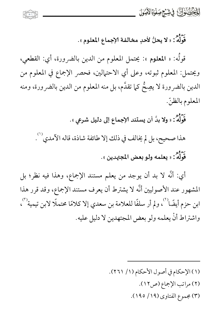 أي: أنَّه لا بد أن يوجد من يعلم مستند الإجماع، وهذا فيه نظر؛ بل المشهور عند الأصوليين أنَّه لا يشترط أن يعرف مستند الإجماع، وقد قرر هذا ابن حزم أيضًا (¬٢)، ولم أر سلفًا للعلامة بن سعدي إلا كلامًا محتملًا لابن تيمية (¬٣)، واشتراط أنْ يعلمه ولو بعض المجتهدين لا دليل عليه.