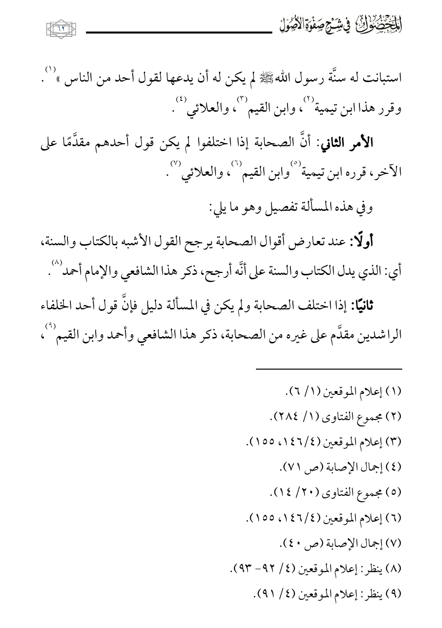 الأمر الثاني: أنَّ الصحابة إذا اختلفوا لم يكن قول أحدهم مقدَّمًا على الآخر، قرره ابن تيمية (¬٥) وابن القيم (¬٦) , والعلائي (¬٧).