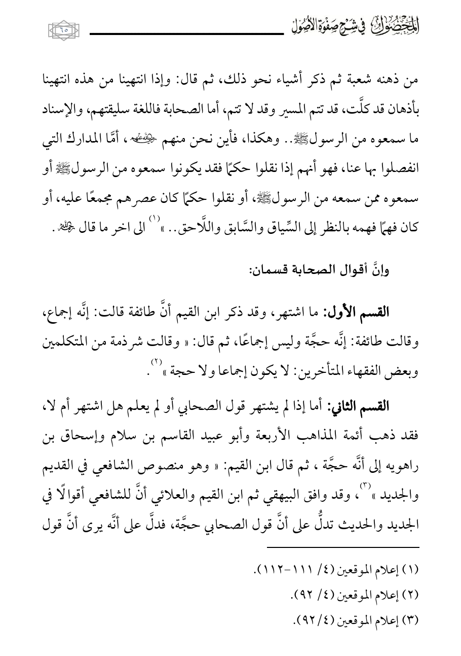 القسم الثاني: أما إذا لم يشتهر قول الصحابي أو لم يعلم هل اشتهر أم لا، فقد ذهب أئمة المذاهب الأربعة وأبو عبيد القاسم بن سلام وإسحاق بن راهويه إلى أنَّه حجَّة، ثم قال ابن القيم: «وهو منصوص الشافعي في القديم والجديد» (¬٣)، وقد وافق البيهقي ثم ابن القيم والعلائي أنَّ للشافعي أقوالًا في الجديد والحديث تدلُّ على أنَّ قول الصحابي حجَّة، فدلَّ على أنَّه يرى أنَّ قول