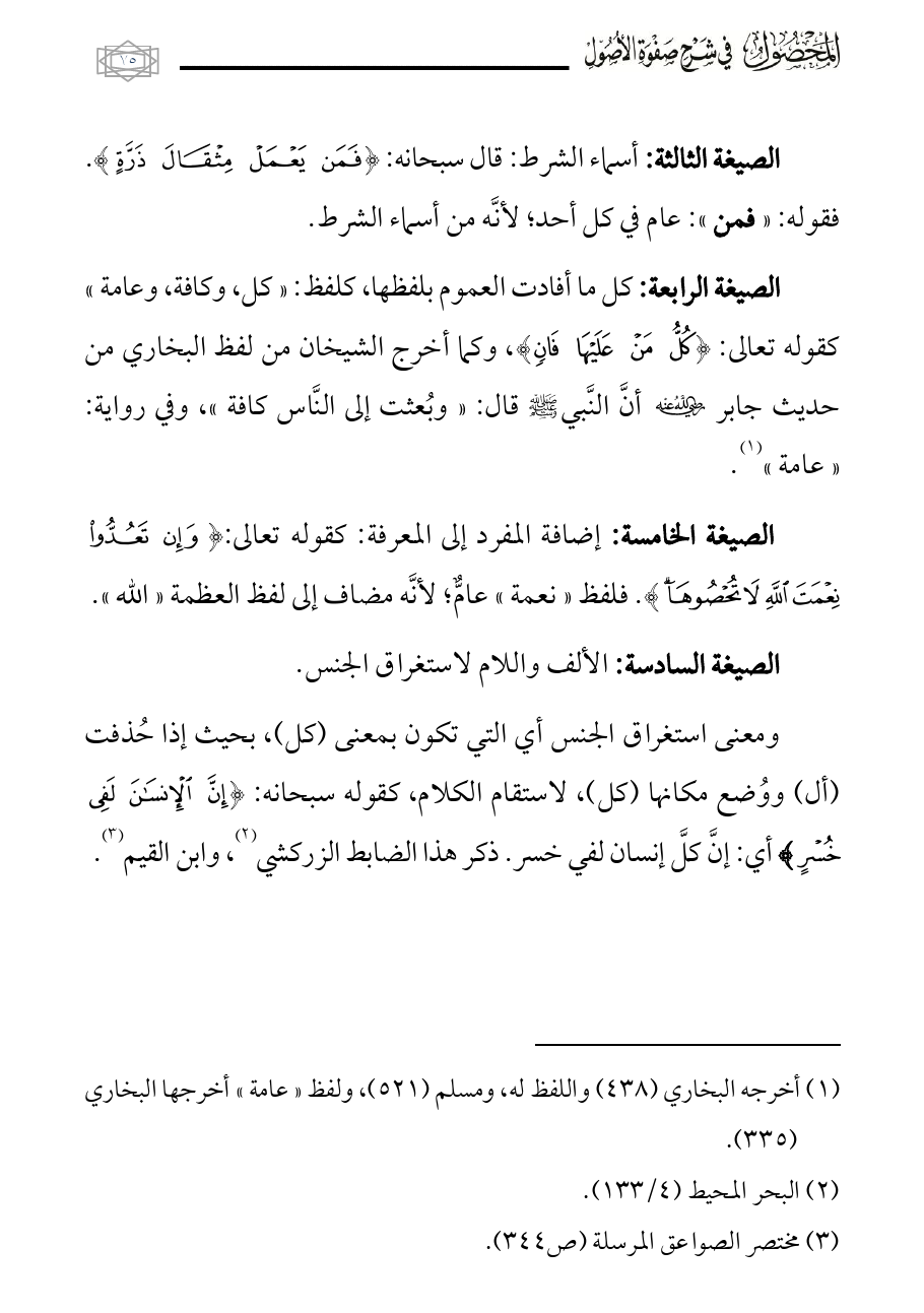 الصيغة الثالثة: أسماء الشرط: قال سبحانه: {فَمَنْ يَعْمَلْ مِثْقَالَ ذَرَّةٍ}. فقوله: «فمن»: عام في كل أحد؛ لأنَّه من أسماء الشرط.