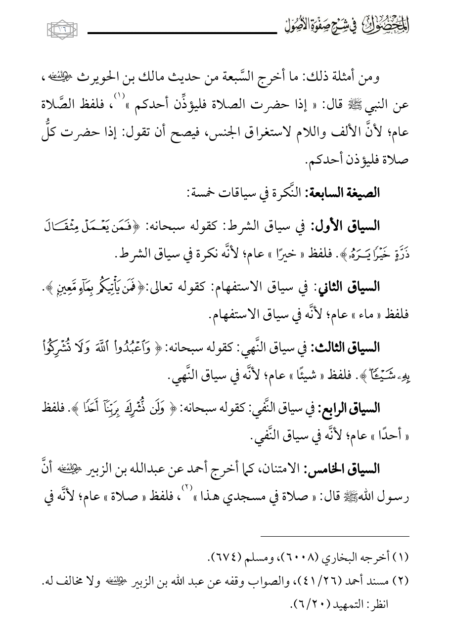 السياق الخامس: الامتنان، كما أخرج أحمد عن عبدالله بن الزبير - رضي الله عنه - أنَّ رسول الله - صلى الله عليه وسلم - قال: «صلاة في مسجدي هذا» (¬٢)، فلفظ «صلاة» عام؛ لأنَّه في
