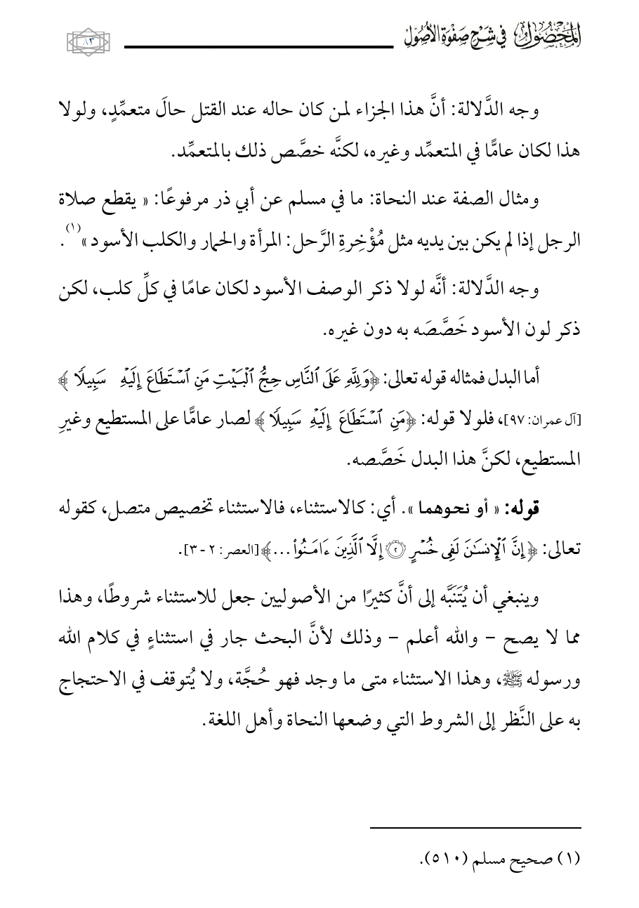 قوله: «أو نحوهما». أي: كالاستثناء، فالاستثناء تخصيص متصل، كقوله تعالى: {إِنَّ الْإِنْسَانَ لَفِي خُسْرٍ (٢) إِلَّا الَّذِينَ آمَنُوا ... }] العصر: ٢ - ٣ [.