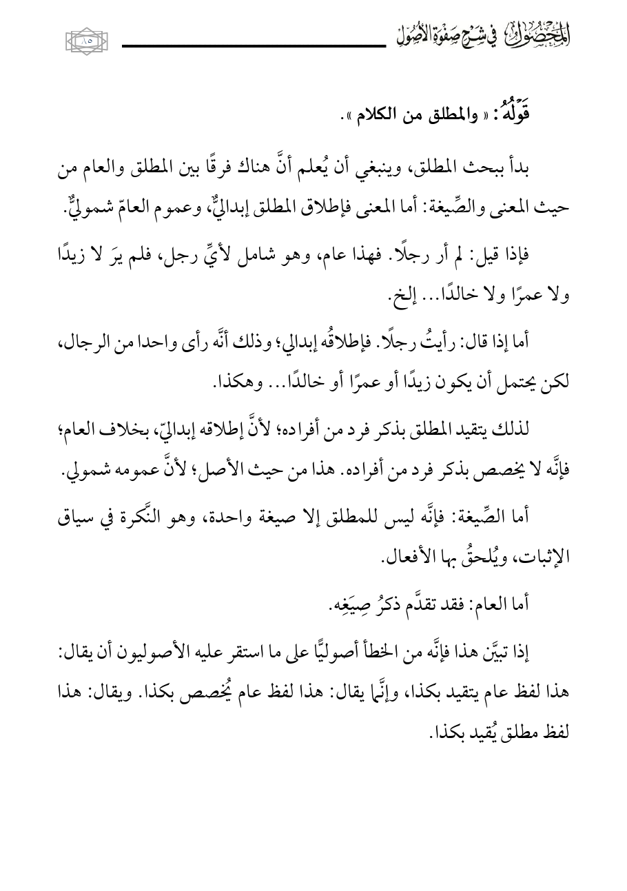 بدأ ببحث المطلق، وينبغي أن يُعلم أنَّ هناك فرقًا بين المطلق والعام من حيث المعنى والصِّيغة: أما المعنى فإطلاق المطلق إبداليٌّ، وعموم العامّ شموليٌّ.