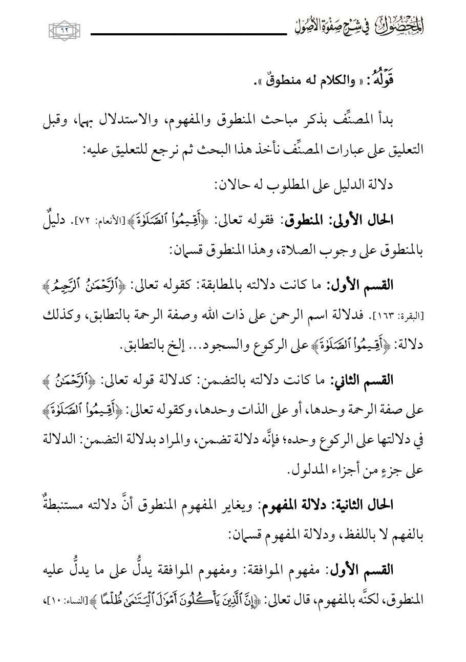 بدأ المصنِّف بذكر مباحث المنطوق والمفهوم، والاستدلال بهما، وقبل التعليق على عبارات المصنِّف نأخذ هذا البحث ثم نرجع للتعليق عليه: