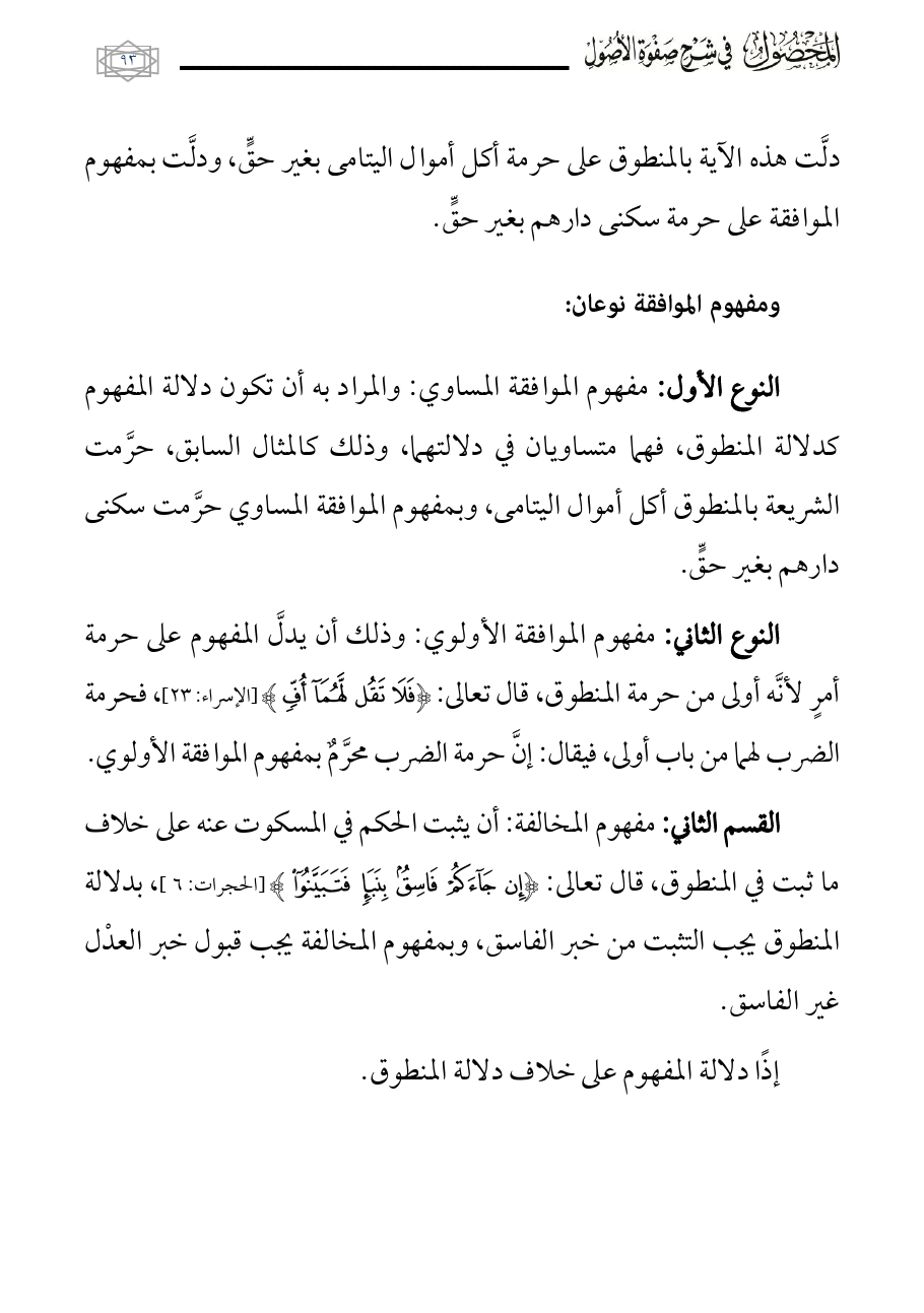 النوع الثاني: مفهوم الموافقة الأولوي: وذلك أن يدلَّ المفهوم على حرمة أمرٍ لأنَّه أولى من حرمة المنطوق، قال تعالى: {فَلَا تَقُلْ لَهُمَا أُفٍّ}] الإسراء: ٢٣ [، فحرمة الضرب لهما من باب أولى، فيقال: إنَّ حرمة الضرب محرَّمٌ بمفهوم الموافقة الأولوي.