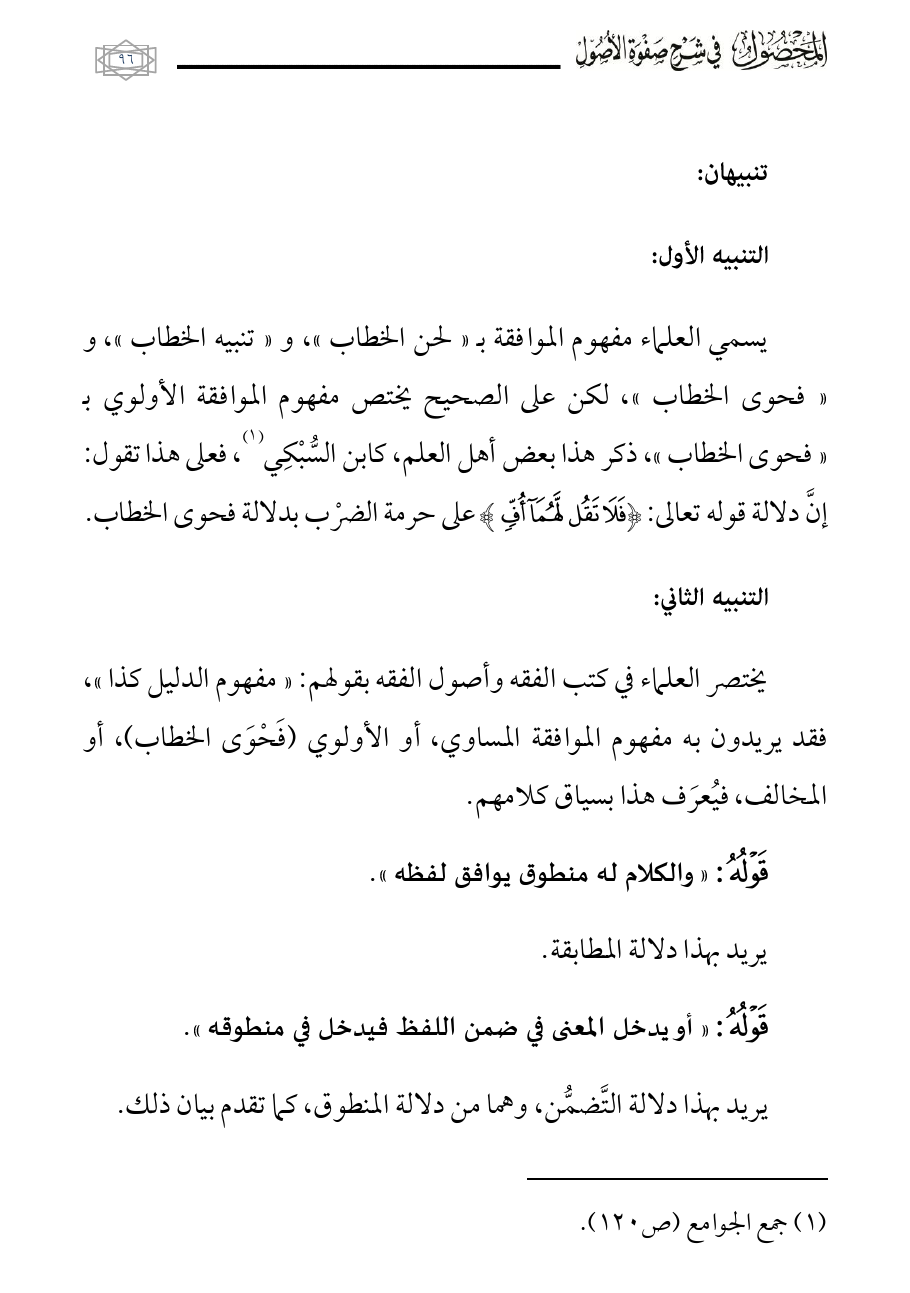 «فحوى الخطاب»، ذكر هذا بعض أهل العلم، كابن السُّبْكِي (¬١)، فعلى هذا تقول: إنَّ دلالة قوله تعالى: {فَلَا تَقُلْ لَهُمَا أُفٍّ} على حرمة الضرْب بدلالة فحوى الخطاب.