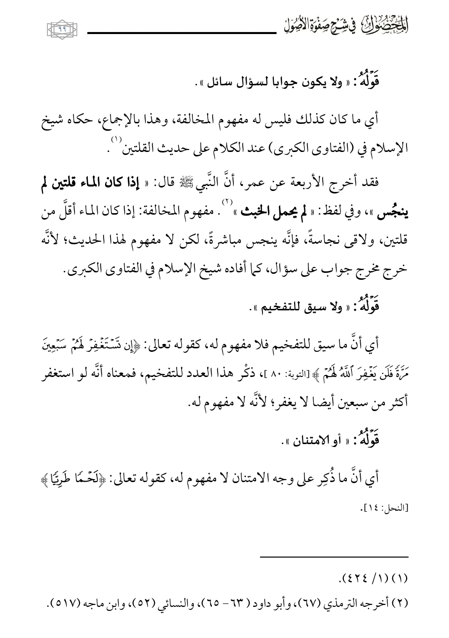 أي ما كان كذلك فليس له مفهوم المخالفة، وهذا بالإجماع، حكاه شيخ الإسلام في (الفتاوى الكبرى) عند الكلام على حديث القلتين (¬١).