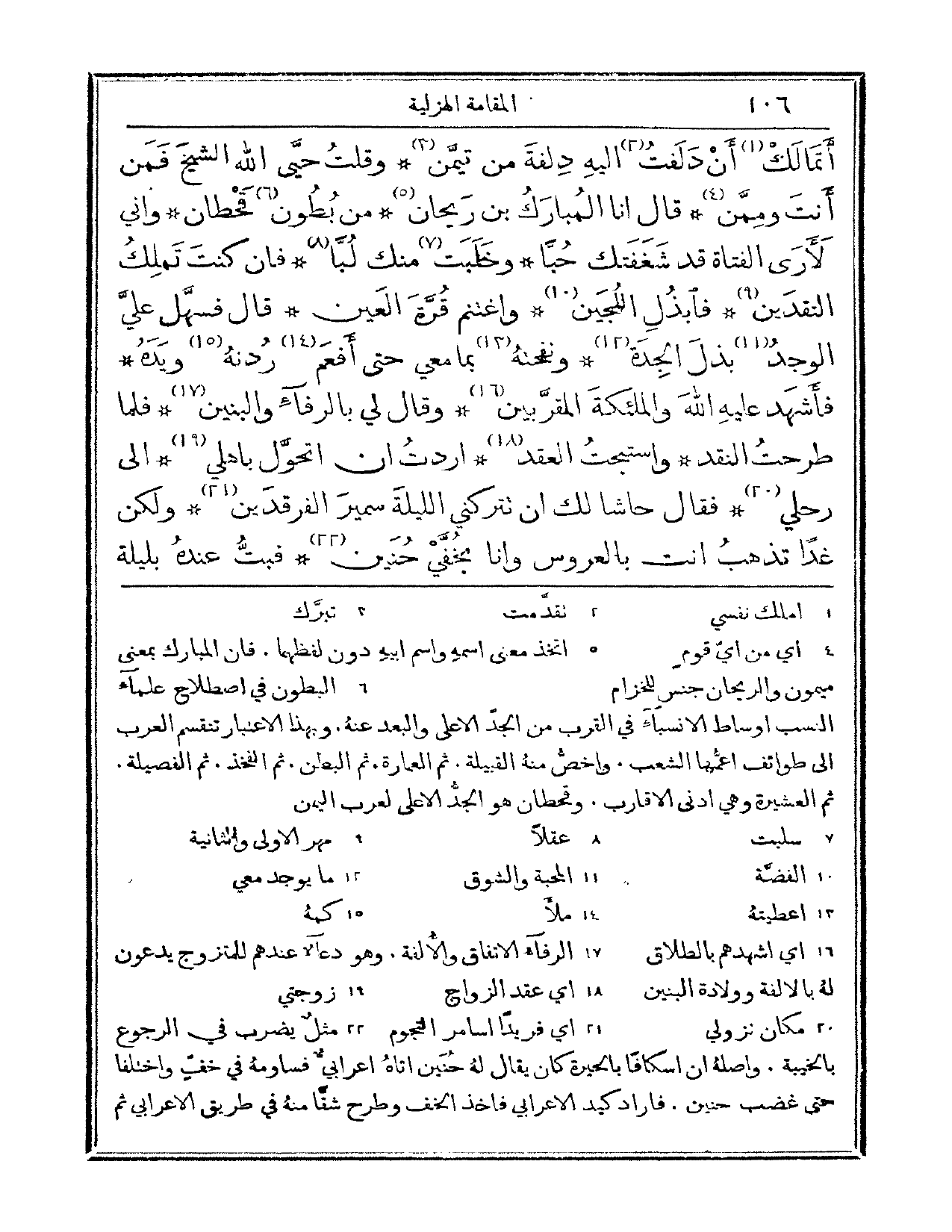 أتمالك أن دلفت إليه دلفة من تيمن، وقلت: حيا الله الشيخ فمن أنت وممن؟ قال: أنا المبارك بن ريحان، من بطون قحطان. وإني لأرى الفتاة قد شغفتك حباً، وخلبت منك لباً. فإن كنت تملك النقدين، فابذل اللجين، واغتنم قرة العين. قال: فهل علي الوجد بذل الجدة، ونفحته بما معي حتى أفعم ردنه ويده. فأشهد عليه الله والملائكة المقربين وقال لي: بالرفاء والبنين! فلما طرحت النقد، واستبحت العقد، أردت أن أتحول بأهلي، إلى رحلي. فقال: حاشا لك أن تتركني الليلة سمير الفرقدين، ولكن غداً تذهب أنت بالعروس وأنا بخفي حنين. فبت عنده بليلة