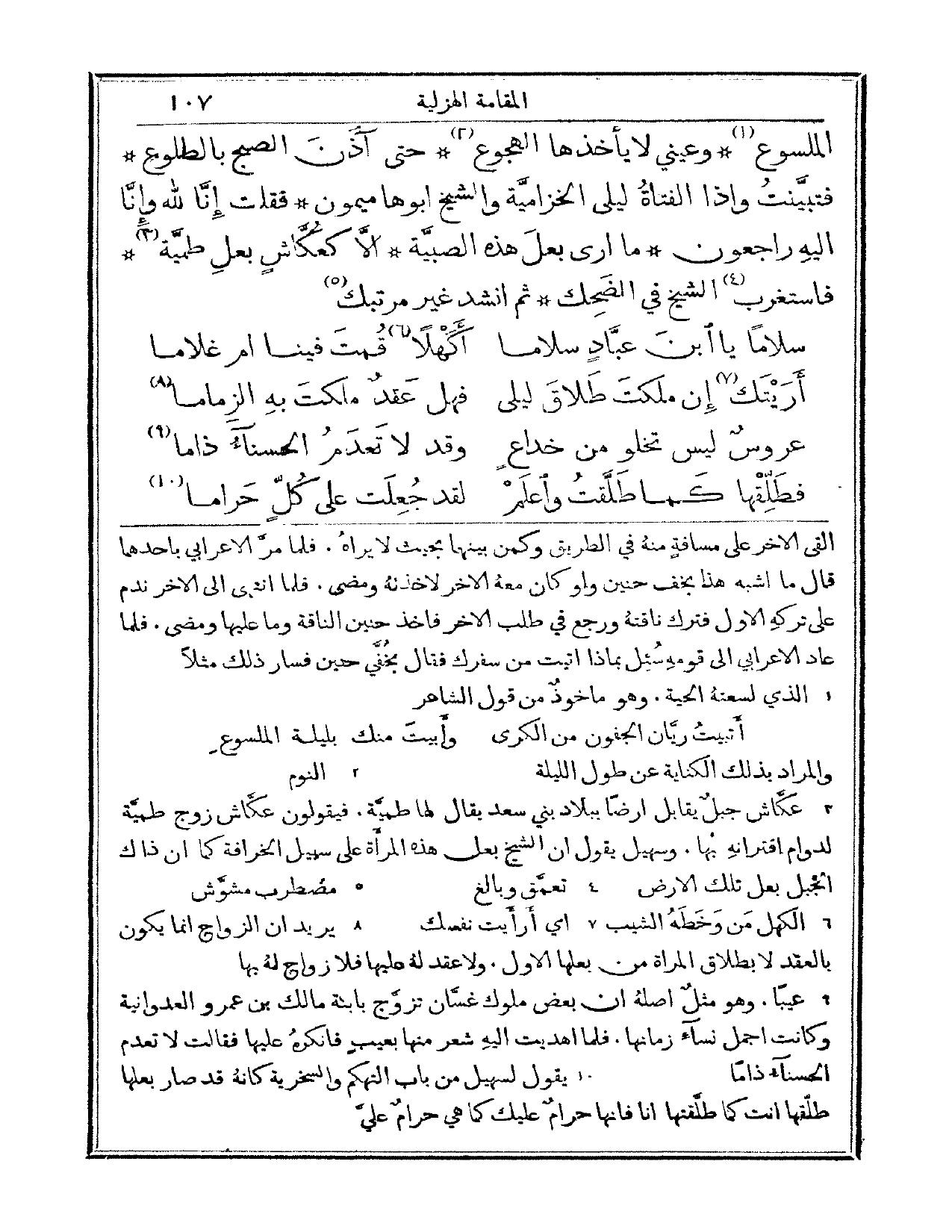 الملسوع، وعيني لا يأخذها الهجوع، حتى آذن الصبح بالطلوع. فتبينت وإذا الفتاة ليلى الخزامية والشيخ أبوها ميمون، فقلت أنا لله وأنا إليه راجعون. ما أرى بعل هذه الصبية، إلا كعكاش بعل طمية. فاستغرب الشيخ في الضحك، ثم أنشد غير مرتبك: