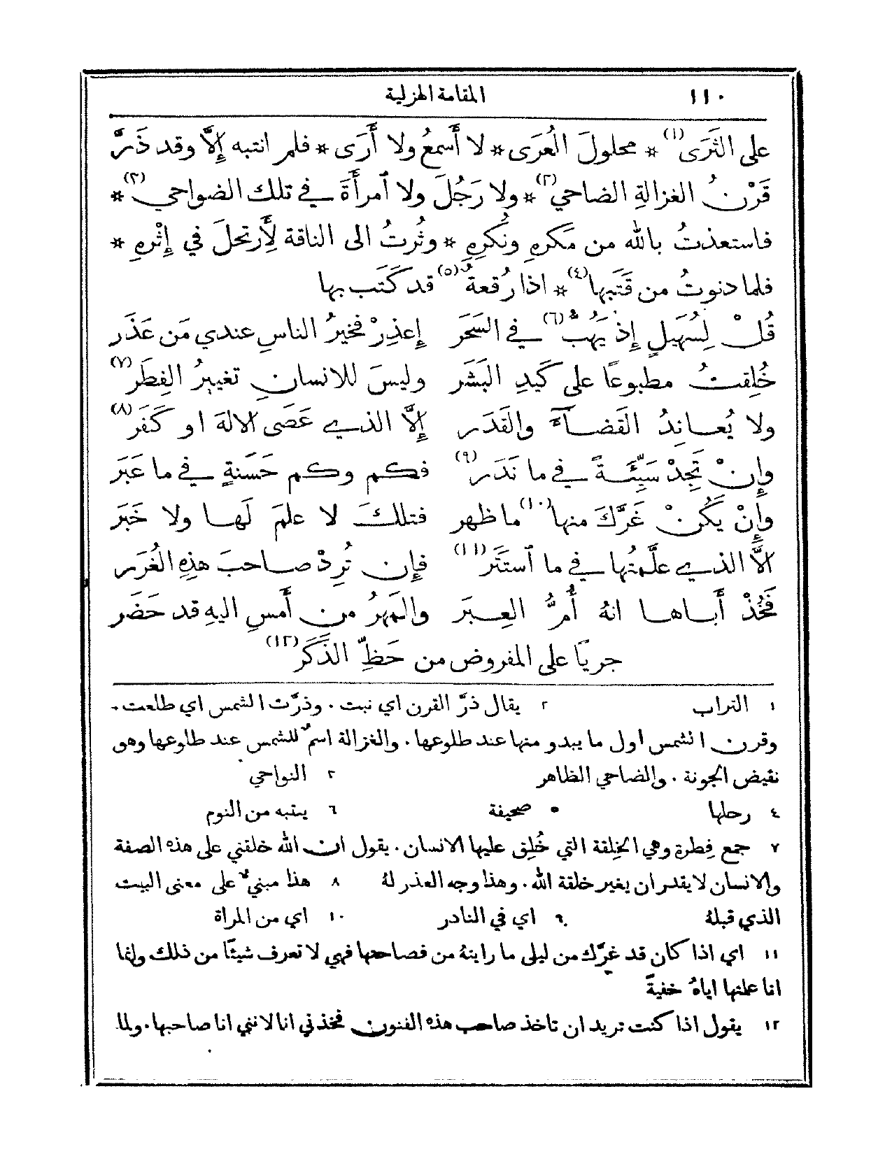 على الثرى محلول العرى، لا أسمع ولا أرى. فلم أنتبه إلا وقد ذر قرن الغزالة الضاحي ولا رجل ولا امرأة في تلك الضواحي. فاستعذت بالله من مكره ونكره، وثرت إلى الناقة لأرتحل في إثره. فلما دنوت من قتبها، إذا رقعة قد كتب بها: