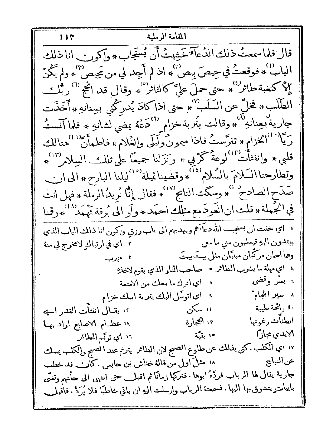 قال: فلما سمعت ذلك الدعاء خشيت أن يستجاب وأكون أنا ذلك الباب. فوقعت في حيص بيص. إذ لم أجد لي من محيص. ولم يكن إلا كنغبة طائر حتى حمل علي كالثائر. وقال: قد أنجح ربك الطلب، فخل عن السلب. حتى إذا كاد يدركني بسنانه، أخذت جارية بعنانه، وقالت: بتربة خزام دعه يمضي لشانه. فلما آنست ريا الخزام، تفرست فإذا ميمون وليلى والغلام. فاطمأن هنالك قلبي، وانفثأت لوعة كربي. ونزلنا جميعاً على تلك السلام، وتطارحنا السلام بالسلام. وقضينا ثميلة ليلنا البارح، إلى أن صدح الصادح، وسكت للنابح. فقال أنا نريد الرملة، فهل أنت في الجملة؟ قلت: إن العود مع مثلك أحمد، ولو إلى برقة ثهمد. وقمنا