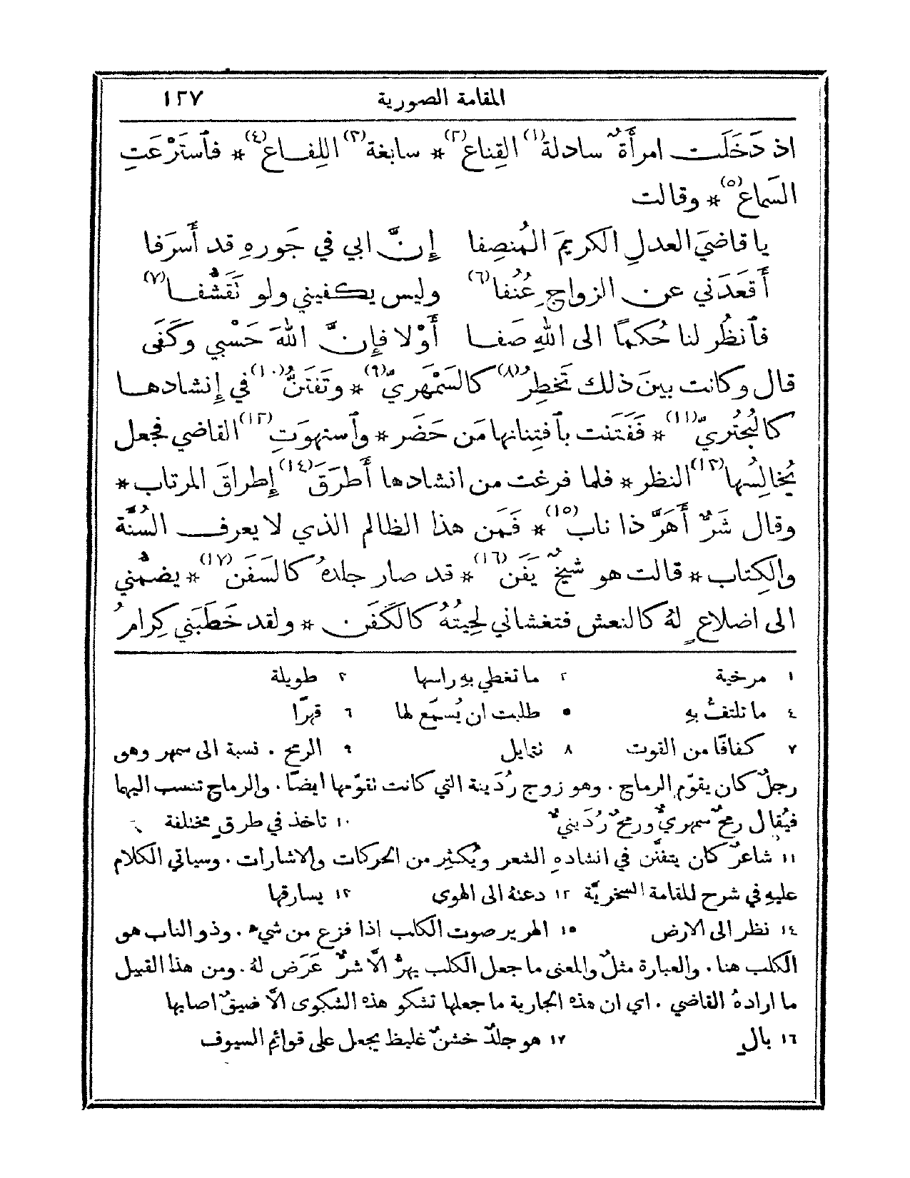 قال: وكانت بين ذلك تخطر كالسمهري، وتفتن في إنشادها كالبحتري. ففتنت بافتنانها من حضر، واستهوت القاضي فجعل يخالسها النظر. فلما فرغت من إنشادها أطرق إطراق المرتاب، وقال: شر أهر ذا ناب، فمن هذا الظالم الذي لا يعرف السنة والكتاب؟ قالت: هو شيخ يفن، قد صار جلده كالسفن، يضمني إلى أضلاع له كالنعش فتعشاني لحيته كالكفن. ولقد خطبني كرام
