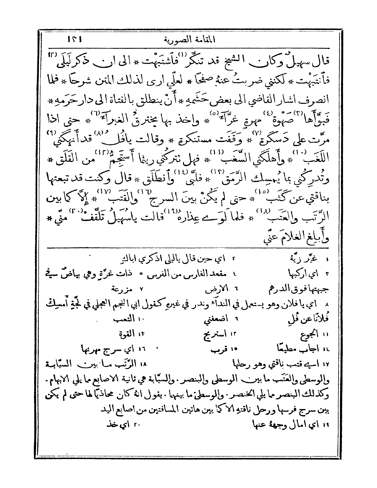 قال سهيل: وكان الشيخ قد تنكر فاشتبهت، إلى أن ذكر ليلى فانتبهت. لكنني ضربت عنه صفحاً، لعلي أرى لذلك المتن شرحاً. فلما انصرف أشار القاضي إلى بعض حشمه، أن ينطلق بالفتاة إلى دار حرمه. فبوأها صهوة مهرة غراء، وأخذ بها يخترق الغبراء. حتى إذا مرت على دسكرة وقفت مستنكرة. وقالت: يا فل قد أنهكني اللغب. وأهلكني السغب. فهل تتركني ريثما أستجم من القلق، وتدركني بما يمسك الرمق! فلبى وانطلق. قال: وكنت قد تبعتها بناقتي عن كثب، حتى لم يكن بين السرج والقتب، إلا كما بين الرتب والعتب. فلما لوى عذاره قالت: يا سهيل تلقف مني، وأبلغ الغلام عني:
