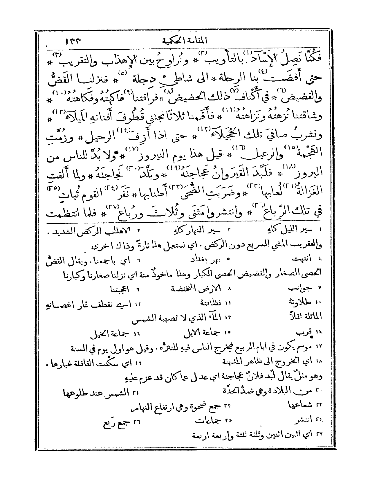 فكنا نصل الإسآد بالتأويب ونراوح بين الإهذاب والتقريب. حتى أفضت بنا الرحلة إلى شاطئ دجلة. فنزلنا القض والقضيض، في أكناف ذلك الحضيض. فراقتنا فاكهته وفكاهته، وشاقتنا نزهته ونزاهته. فأقمنا ثلاثاً نجتني قطوف أفنانه الميلاء، ونشرب صافي تلك الحجيلاء. حتى إذا أزف الرحيل، وزمت الهجمة والرعيل. قيل هذا يوم النيروز. ولا بد للناس من البروز. فلبد القيروان عجاجته وبلد لجاجته. ولما ألقت الغزالة لعابها، وضربت الضحى أطنابها. نقر القوم ثبات في تلك الرباع، وانتشروا مثنى وثلاث ورباع. فلما انتظمت