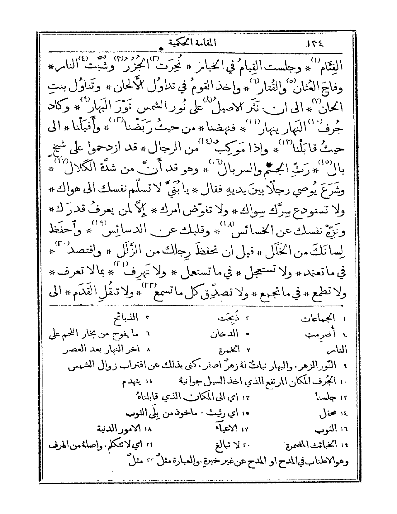 الفئام، وجلست القيام في الخيام. نحرت الجزر وشبت النار، وفاح العثان والقتار. وأخذ القوم في تداول الألحان وتناول بنت الحان. إلى نثر الأصيل على نور الشمس نور البهار، وكاد جرف النهار ينهار. فنهضنا، من حيث ربضنا، وأقبلنا إلى حيث قابلنا. وإذا موكب من الرجال، قد ازدحموا على شيخ بال رث الجسم والسربال، وهو قد أن من شدة الكلال، وشرع يوصي رجلاً بين بديه فقال: يا بني لا تسلم نفسك إلى هواك، ولا تستودع سرك سواك. ولا تفوض أمرك، إلا لمن يعرف قدرك. ونزه نفسك عن الخسائس، وقلبك عن الدسائس. واحفظ لسانك من الخلل، قبل أن تحفظ رجلك من الزلل. واقتصد في ما تعتمد. ولا تستعجل، في ما تستعمل. ولا تهرف، بما لا تعرف. ولا تطمع، في ما تجمع، ولا تصدق كل ما تسمع. ولا تنقل القدم، إلى