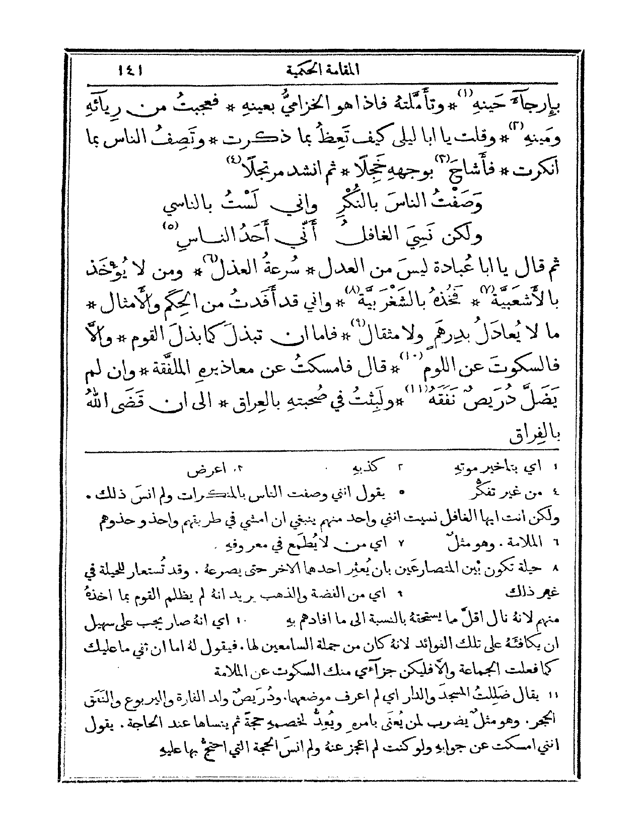 ثم قال: يا أبا عبادة ليس من العدل سرعة العذل. ومن لا يؤخذ بالأشعبية، فخذه بالشفربية. وإني قد أفدت من الحكم والأمثال، ما لا يعادل بدرهم ولا مثقال. فإما أن تبذل كما بذل القوم، وإلا فالسكوت عن اللوم. قال: فأمسكت عن معاذير الملفقة، وإن لم يضل دريص نفقه. ولبثت في صحبته بالعراق، إلى أن قضى الله بالفراق.
