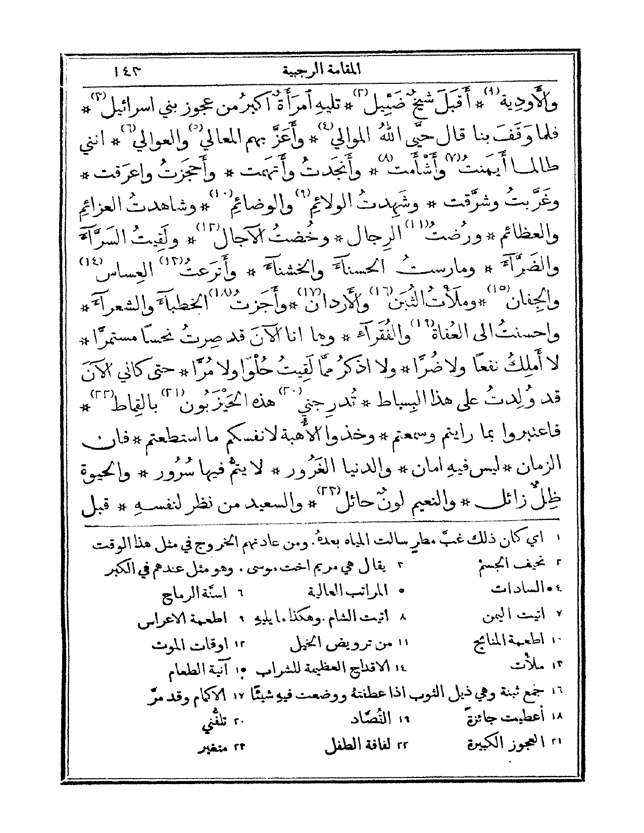 والأودية. أقبل شيخ ضئيل، تليه امرأة أكبر من عجوز بني إسرائيل. فلما وقف بنا قال: حيا الله الموالي، وأعز بهم المعالي والعوالي. أنني طالما أيمنت وأشأمت، وأنجدت وأتهمت وأحجزت وأعرقت، وغربت وشرقت، وشهدت الولائم والوضائم، وشاهدت العزائم والعظائم. ورضت الرجال، وخضضت الآجال. ولقيت السراء والضراء، ومارست الحسناء والخثناء. وأترعت العساس والجفان، وملأت الثبن والأردان. وأجزت الخطباء والشعراء، وأحسنت إلى العفاة والفقراء. وها أنا الآن قد صرت نحساً مستمراً، لا أملك نفعاً ولا ضراً، ولا أذكر مما لقيت حلواً ولا مراً. حتى كأني الآن قد ولدت على هذا البساط، تدرجني هذه الحيزبون بالقماط. فاعتبروا بما رأيتم وسمعتم وخذوا الأهلة لأنفسكم ما استطعتم. فإن الزمان، ليس فيه أمان. والدنيا الغرور، لا يتم فيها سرور. والحياة ظل زائل والنعيم لون حائل. والسعيد من نظر لنفسه، قبل