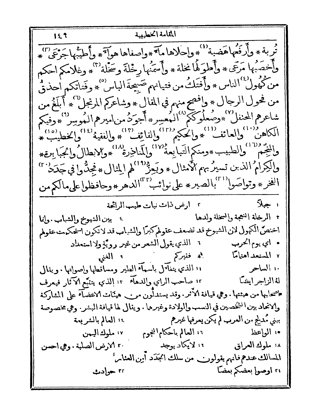 تربة، وأرفعها هضبة. وأحلاها ماء، وأصفاها هواء. وأطيبها جرعى، وأخصبها مرعى. وأطولها نخلة، وأسمنها رخلة وسخلة. وغلامكم أحكم من كهول الناس، وأفتك من فتيانهم صبيحة الباس. وفتاتكم أحذق من فحول الرجال، وأفصح منهم في المقال. وشاعركم المرتجل، ابلغ من شاعرهم المحتفل. وصعلوككم المعسر، أجود من أميرهم الموسر. وفيكم الكاهن والعائف، والحكيم والقائف. والفقيه والخطيب، والمنجم والطبيب. ومنكم التبابعة والمناذرة، والأبطال والجبابرة. والكرام الذين تسير بهم الأمثال، ويعز لهم المثال. فجدوا في جدد الفخر، وتواصوا بالصبر، أعلى نوائب الدهر. وحافظوا على مالكم من