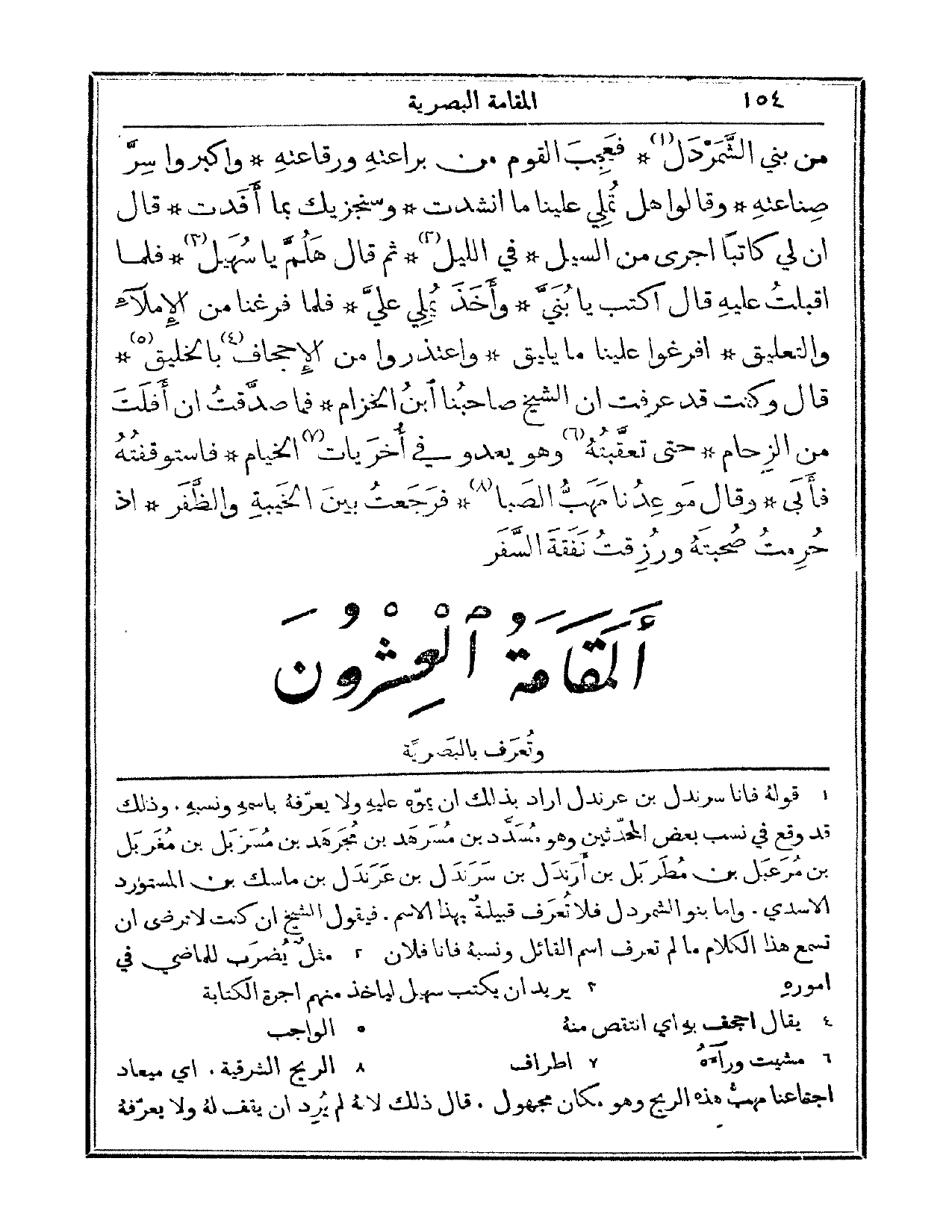 من بني الشمردل. فعجب القوم من براعته ورقاعته، وأكبروا سر صناعته. وقالوا: هل تملي علينا ما أنشدت، وسنجزيك بما أفدت. قال: إن لي كاتباً أجرى من السيل، في الليل، ثم قال: هلم يا سهيل. فلما أقبلت عليه قال: اكتب يا بني، وأخذ يملي علي. فلما فرغنا من الإملاء والتعليق، أفرغوا علينا ما يليق، واعتذروا من الإجحاف بالخليق. قال: وكنت قد عرفت أن الشيخ صاحبنا ابن الخزام، فما صدقت أن أفلت من الزحام، حتى تعقبته وهو يعدو في أخريات الخيام. فاستوقفته فأبى، وقال موعدنا مهب الصبا. فرجعت بين الخيبة والظفر، إذ حرمت صحبته ورزقت نفقة السفر.