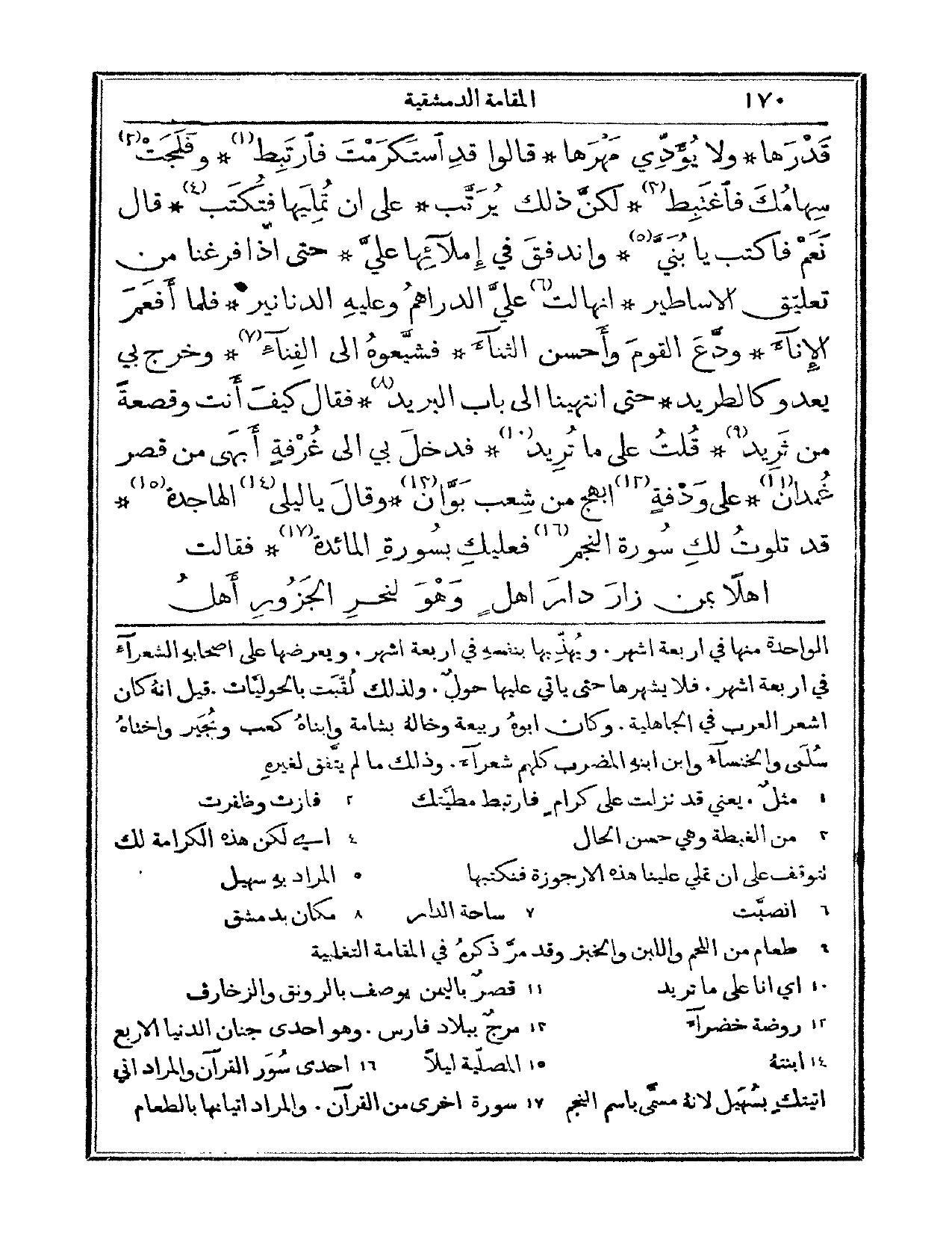 قدرها ولا يؤدي مهرها. قالوا: قد استكرمت فارتبط، وفلجت سهامك فاغتبط. لكن ذلك يرتب، على أن تمليها فتكتب. قال: نعم فاكتب يا بني، واندفق في إملائها علي. حتى إذا فرغنا من تعليق الأساطير، انهالت علي الدراهم وعليه الدنانير. فلما أفعم الإناء ودع القوم وأحسن الثناء، فشيعوه إلى الفناء. وخرج بي يعدو كالطريد، حتى انتهينا إلى باب البريد، فقال: كيف أنت وقصعة من ثريد؟ قلت: على ما تريد. فدخل بي إلى غرفة أبهى من قصر غمدان، على ودفة أبهج من شعب بوان. وقال: يا ليلى الهاجدة، قد تلوت لك سورة النجم فعليك بسورة المائدة. فقال: