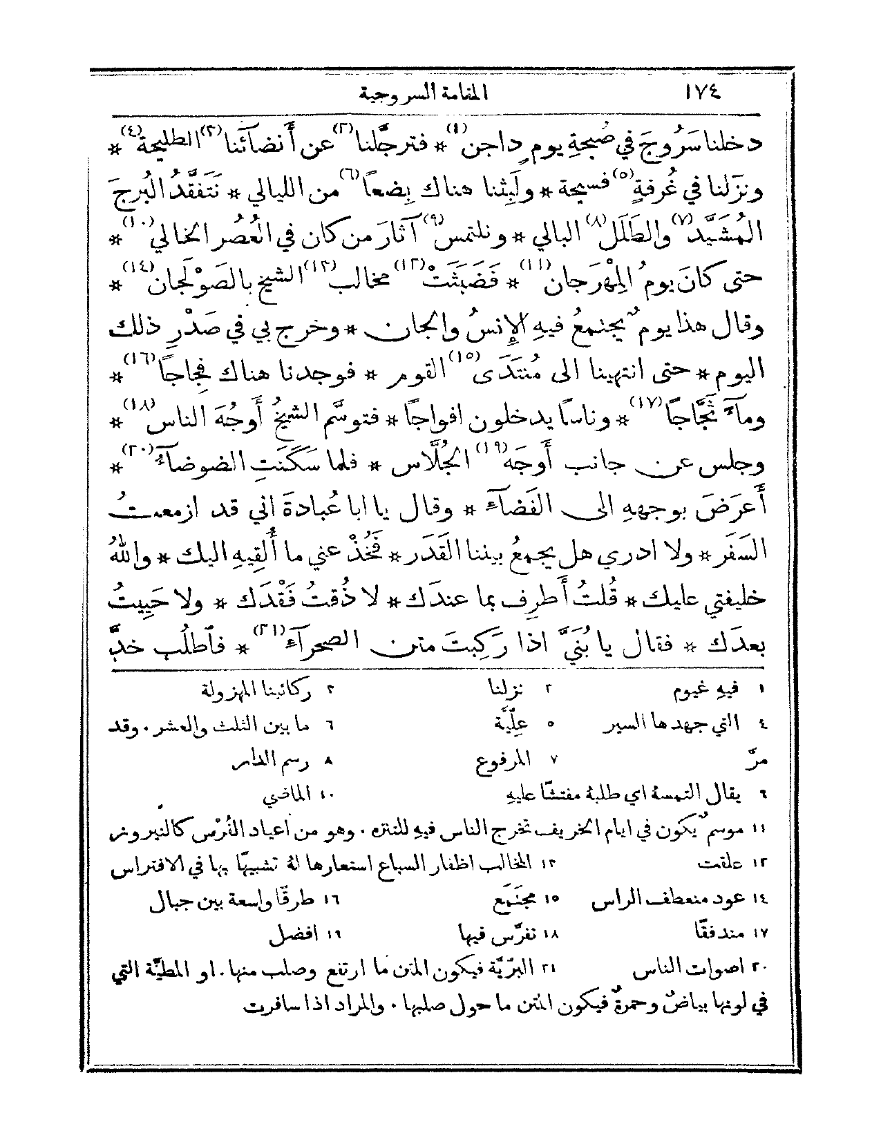 دخلنا سروج في صبحة يومٍ داجن. فترجلنا عن أنضائنا الطليحة، ونزلنا في غرفة فسيحة. ولبثنا هناك بضعاً من الليالي، نتفقد البرج المشيد والطلل البالي، ونلتمس آثار من كان في العصر الخالي. حتى كان يوم المهرجان، فضبثت مخالب الشيخ بالصولجان، وقال: هذا يومٌ يجتمع فيه الإنس والجان. وخرج بي في صدر ذلك اليوم، حتى انتهينا إلى منتدى القوم. فوجدنا هناك فجاجاً، وماء ثجاجاً، وناساً يدخلون أفواجاً. فتوسم الشيخ أوجه الناس، وجلس عن جانب أوجه الجلاس. فلما سكنت الضوضاء، أعرض بوجهه إلى الفضاء. وقال: يا أبا عبادة إني قد أزمعت السفر، ولا أدري هل يجمع بيننا القدر. فخذ عني ما ألقيه إليك، والله خليفتي عليك. قلت: أطرف بما عندك، لا ذقت فقدك، ولا حييت بعدك! فقال: يا بني إذا ركبت متن الصحراء، فاطلب خد