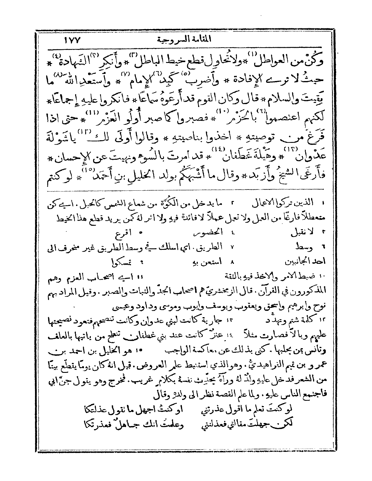 وكن من العواطل، ولا تحاول قطع خيط الباطل. وأنكر الشهادة، حيث لا ترى الإفادة. واضرب كبد الإمام، واستعد الله ما بقيت والسلام. قال: وكان القوم قد أرعوه سماعاً فأنكروا عليه إجماعاً. ولكنهم اعتصموا بالحزم، فصبروا كما صبر أولو العزم. حتى إذا فرغ من توصيته، أخذوا بناصيته. وقالوا: أولى لك يا شولة عدوان، وهيلة غطفان، قد أمرت بالسوء ونهيت عن الإحسان! فأرغى الشيخ وأزيد، وقال: ما أشبهكم بولد الخليل بن أحمد. لو كنتم