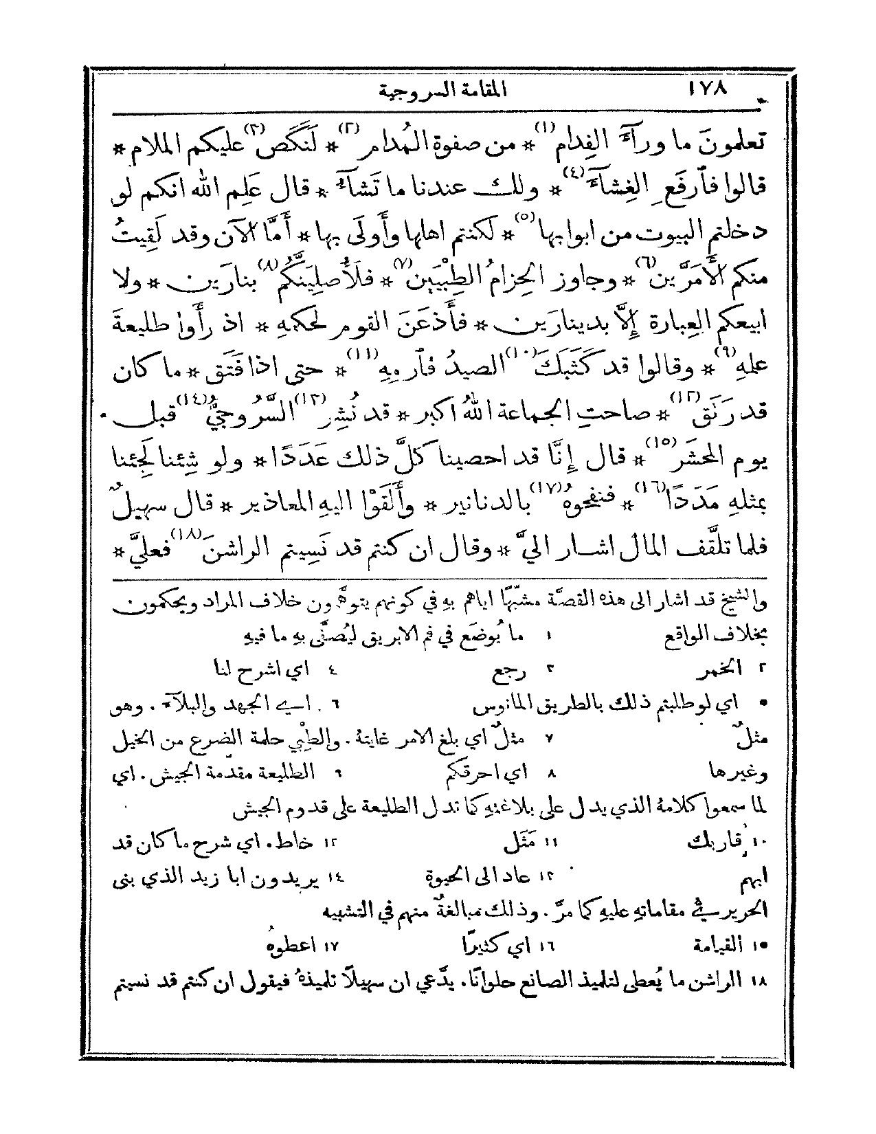 تعلمون ما وراء الفدام، من صفوة المدام، لنكص عليكم الملام. قالوا: فارفع الغشاء، ولك عندنا ما تشاء. قال: علم الله أنكم لو دخلتم البيوت من أبوابها، لكنتم أهلها وأولى بها. أما الآن وقد لقيت منكم الأمرين، وجاوز الحزام الطبيين، فلأصلينكم بنارين، ولا أبيعكم العبارة إلا بدينارين. فأذعن القوم لحكمه، إذ رأوا طليعة علمه، وقالوا: قد كثبك الصيد فارمه. حتى إذا فتق ما كان قد رتق. صاحت الجماعة: الله أكبر! قد نشر السروجي قبل يوم المحشر. قال: إنا قد أحصينا كل ذلك عدداً، ولو شئنا لجئنا بمثله مدداً. فنفحوه بالدنانير، وألقوا إليه المعاذير. قال سهيل: فلما تلقف المال أشار إلي، وقال: إن كنتم قد نسيتم الراشن فعلي.