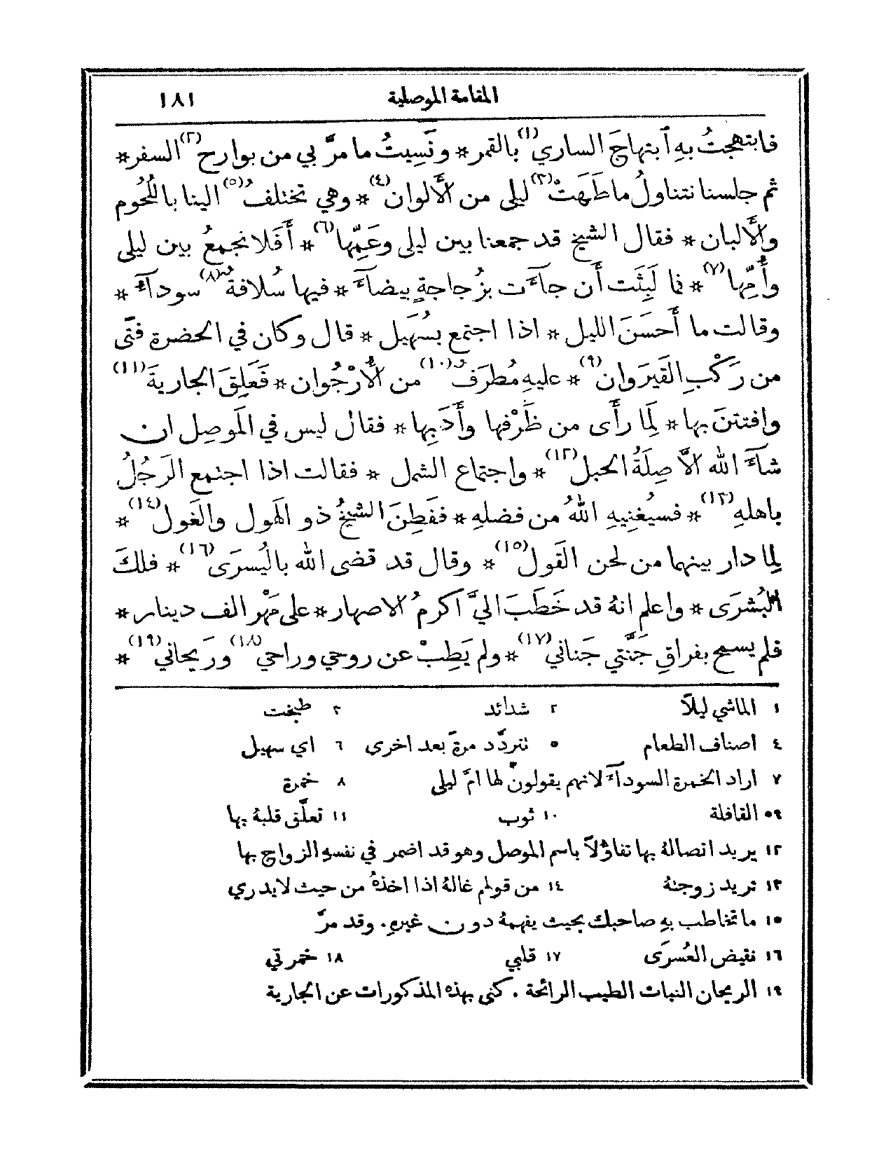 فابتهجت به ابتهاج الساري بالقمر، ونسيت ما مر بي من بوارح السفر. ثم جلسنا نتناول ما طهت ليلى من الألوان، وهي تختلف إلينا باللحوم والألبان. فقال الشيخ: قد جمعنا بين ليلى وعمها، أفلا نجمع بين ليلى وأمها؟ فما لبثت أن جاءت بزجاجة بيضاء، فيها سلافةٌ سوداء. وقالت: ما أحسن الليل إذا اجتمع بسهيل! قال: وكان في الخصرة فتى من ركب القيروان، عليه مطرف من الأرجوان. فعلق الجارية وافتتن بها، لما رأى من ظرفها وأدبها. فقال: ليس في الموصل إن شاء الله إلا صلة الحبل، واجتماع الشمل. فقالت: إذا اجتمع الرجل بأهله، فسيغنيه الله من فضله. ففطن الشيخ ذو الهول والغول، لما دار بينهما من لحن القول. وقال: قد قضى الله باليسرى، فلك البشرى. واعلم أنه قد خطب إلي أكرم الأصهار، على مهر ألف دينار. فلم يسمح بفراق جنتي جناني، ولم يطب عن روحي وراحي وريحاني.