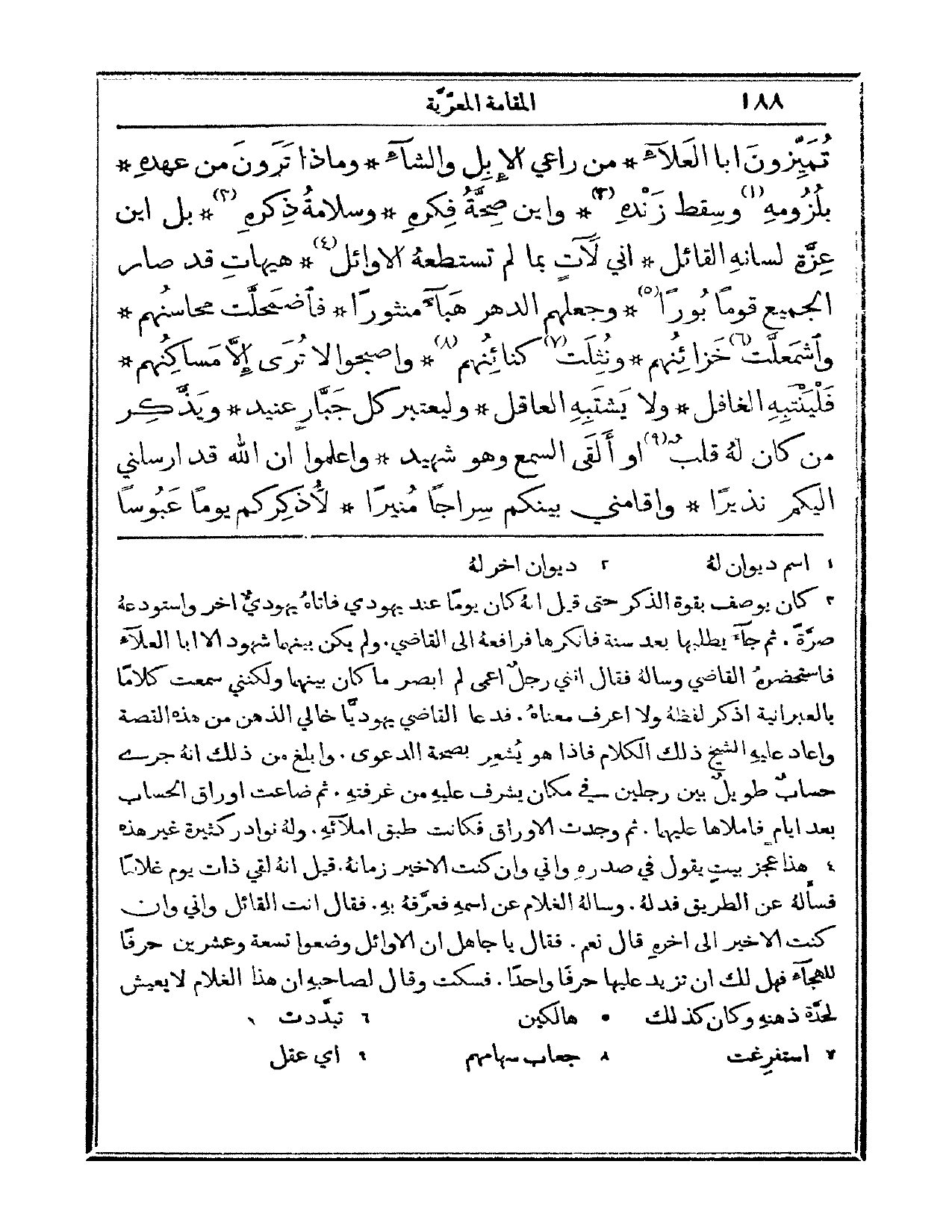 تميزون أبا العلاء، من راعي الإبل والشاء؟ وماذا ترون من عهده، بلزومه وسقط زنده؟ وأين صحة فكره، وسلامة ذكره؟ بل أين عزة لسانه القائل: إني لآتٍ بما لم تستطعه الأوائل؟ هيهات قد صار الجميع قوماً بوراً، وجعلهم الدهر هباءً منثوراً! فاضمحلت محاسنهم، واشمعلت خزائنهم ونثلت كنائنهم، وأصبحوا لا ترى إلا مساكنهم فلينتبه الغافل ولا يشتبه العاقل. وليعتبر كل جبار عنيد ويذكر من كل له قلب أو ألقى السمع وهو شهيد. واعلموا أن الله قد أرسلني إليكم نذيراً، وأقامني بينكم سراحاً منيراً لأذكركم يوماً عبوساً